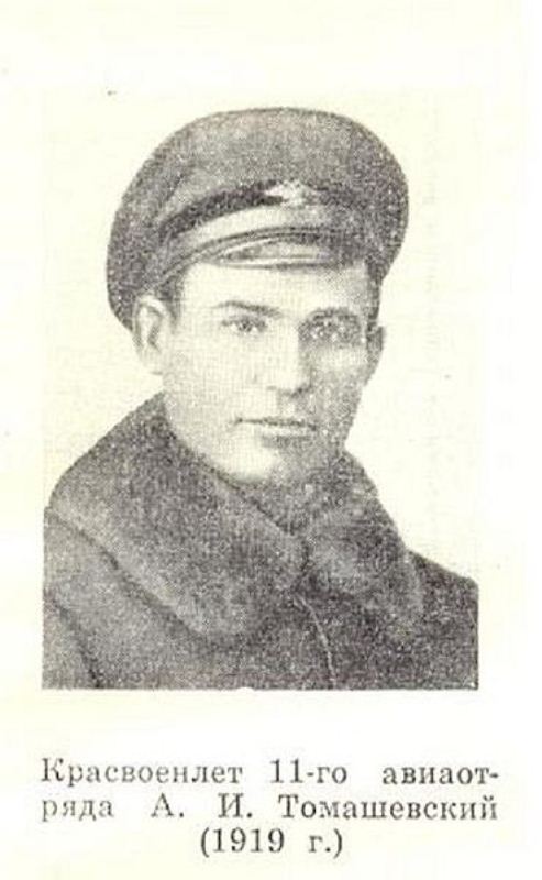 Тов. Томашевский, бывший моряк Балтийского флота, поступил борт-механиком в авиацию в 1910 году. В гражданской войне, на западном фронте, командовал авиоотрядами. За боевые подвиги был награжден орденом Красного Знамени.