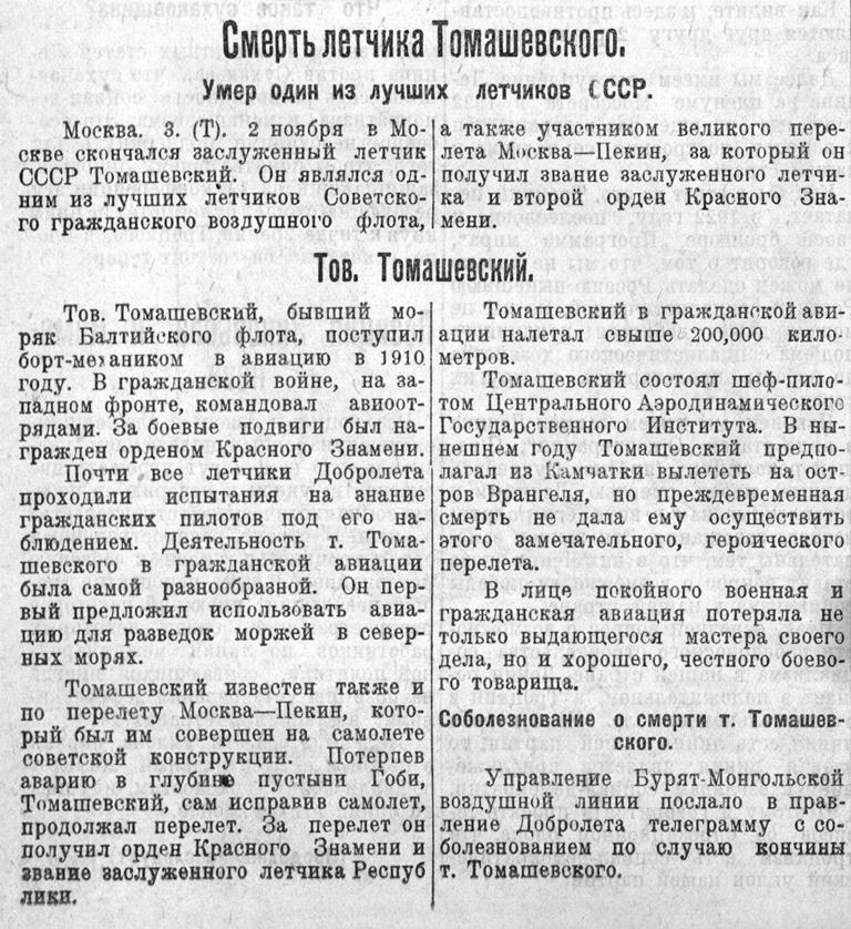 Москва. 3. (Т). 2 ноября в Москве скончался заслуженный летчик СССР Томашевский. Он являлся одним из лучших летчиков Советского гражданского воздушного флота, а также участником великого перелета Москва — Пекин, за который он получил звание заслуженного летчика и второй орден Красного Знамени.