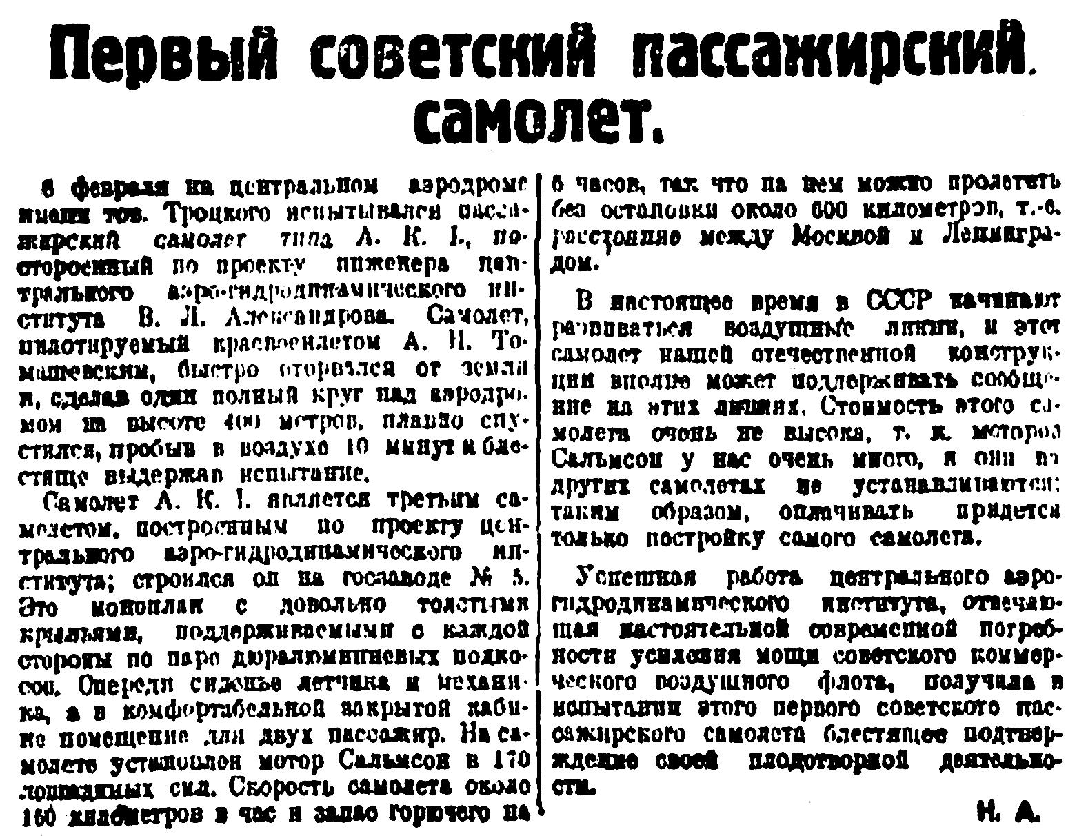 8 февраля на центральном аэродроме имени тов. Троцкого испытывался пассажирский самолет типа А. К. 1., построенный по проекту инженера центрального аэродинамического института В. Л. Александрова. Самолет, пилотируемый красвоенлетом А. И. Томашевским, быстро оторвался от земли и, сделав один полный круг над аэродромом на высоте 400 метров, плавно спустился, пробыв в воздухе 10 минут и блестяще выдержал испытание.