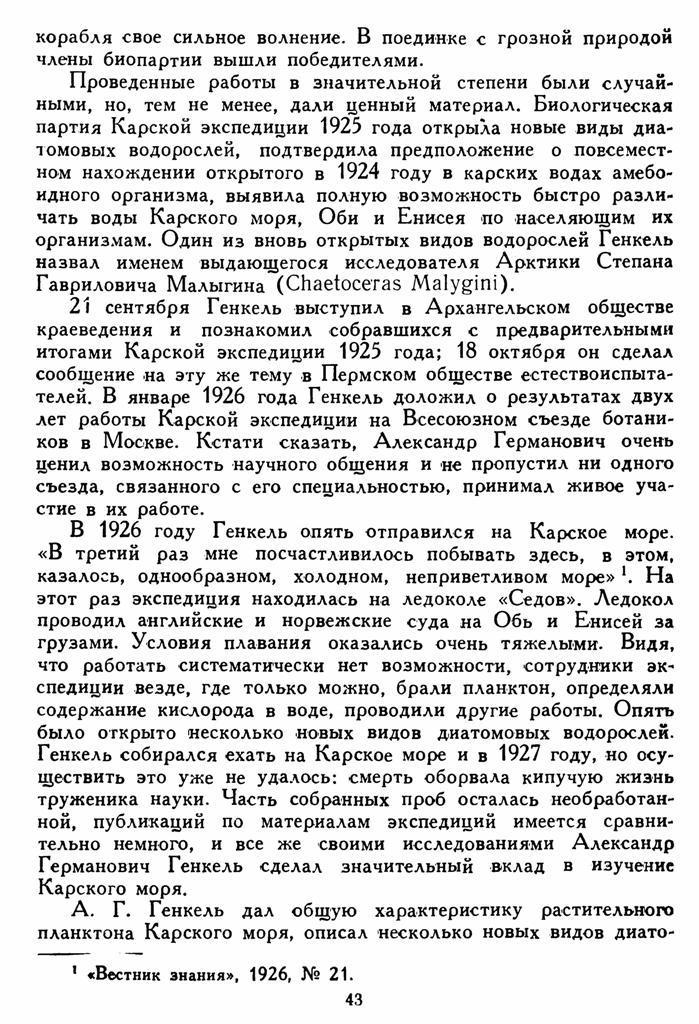 В 1926 году Генкель опять отправился на Карское море. «В третий раз мне посчастливилось побывать здесь, в этом, казалось, однообразном, холодном, неприветливом море» {1}. На этот раз экспедиция находилась на ледоколе «Седов». Ледокол проводил английские и норвежские суда на Обь и Енисей за грузами. Условия плавания оказались очень тяжелыми. Видя, что работать систематически нет возможности, сотрудники экспедиции везде, где только можно, брали планктон, определяли содержание кислорода в воде, проводили другие работы. Опять было открыто несколько новых видов диатомовых водорослей. Генкель собирался ехать на Карское море и в 1927 году, но осуществить это уже не удалось: смерть оборвала кипучую жизнь труженика науки. Часть собранных проб осталась необработанной, публикаций по материалам экспедиций имеется сравнительно немного, и все же своими исследованиями Александр Германович Генкель сделал значительный вклад в изучение Карского моря.