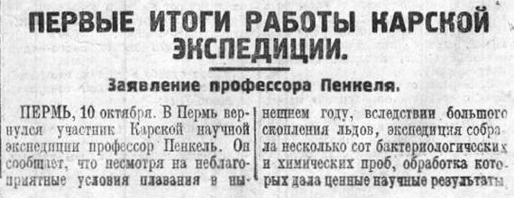 ПЕРМЬ, 10 октября. В Пермь вернулся участник Карской научной экспедиции профессор Пенкель. Он сообщает, что несмотря на неблагоприятные условия плавания в нынешнем году, вследствие большого скопления льдов, экспедиция собрала несколько сот бактериологических и химических проб, обработка которых дала ценные научные результаты.