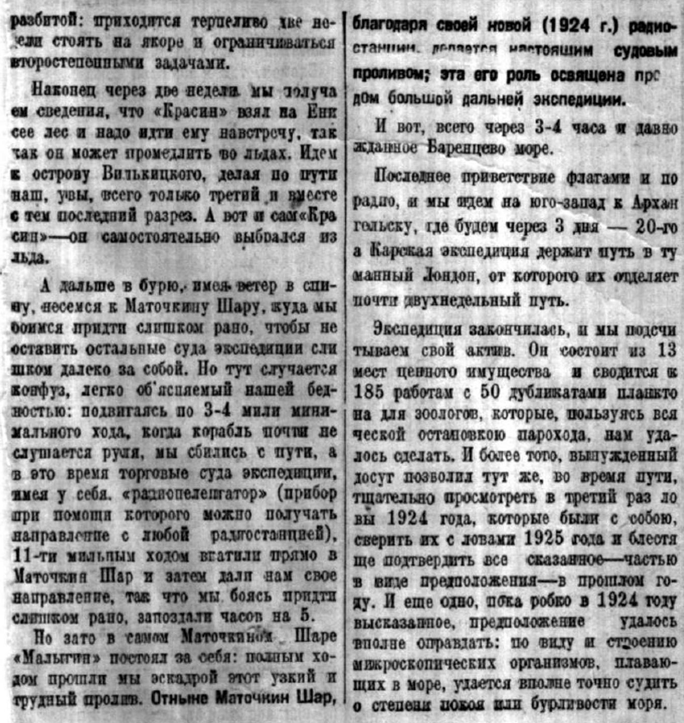 30-го июля 1925 года тот самый пароход «Малыгин», в 2.800 лошадиных сил, 44 саж. длины, о четырех котлах и 17 узловым максимальным ходом (это верст 30 в час) вышел во Архангельского порта в помощь Карской экспедиции.