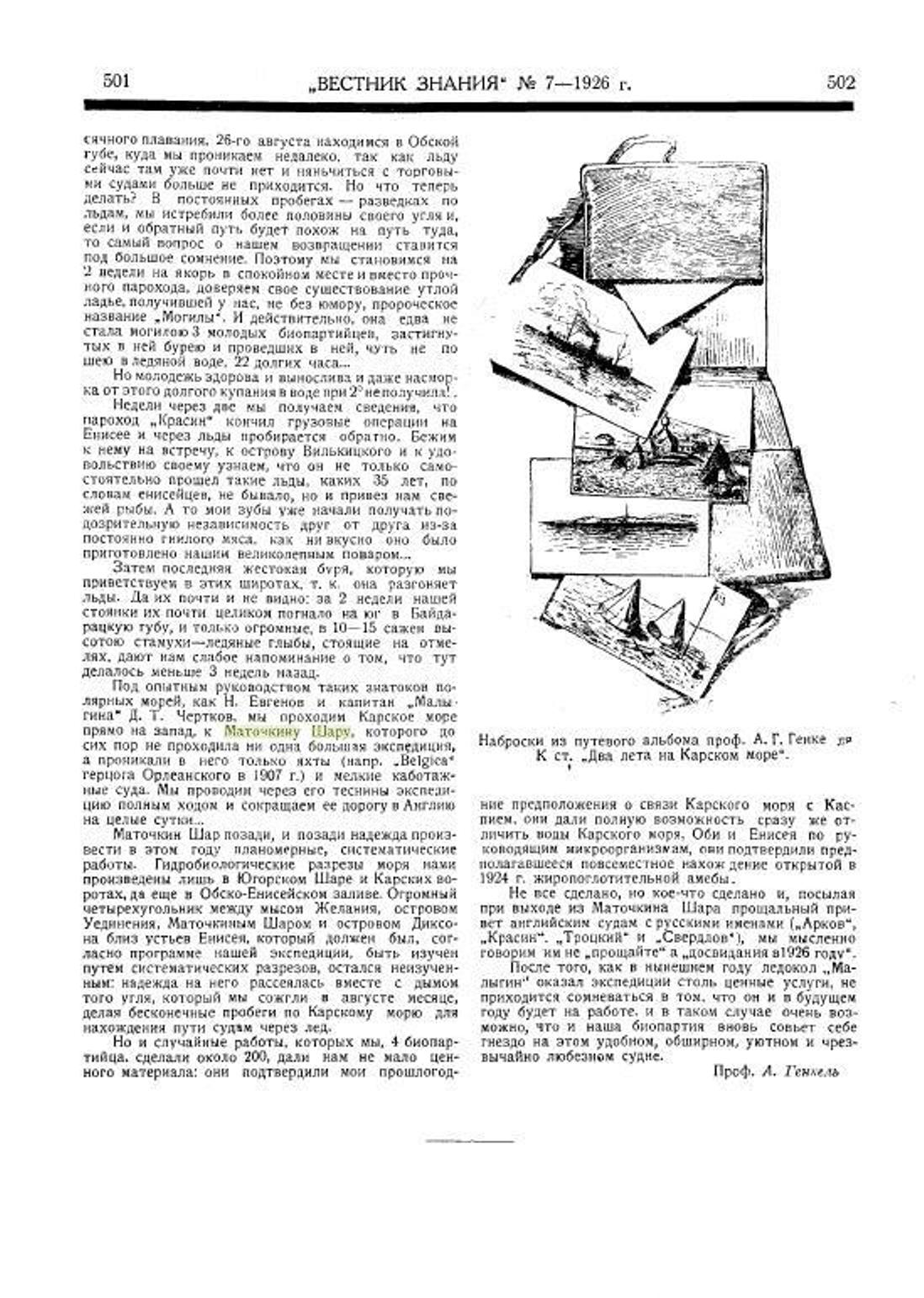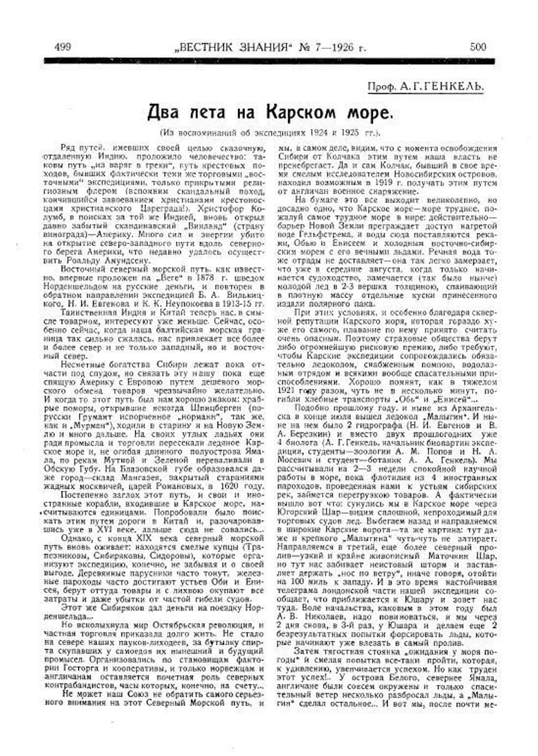 Генкель А.Г.Два пета на Карском море(Из воспоминаний об экспедициях 1924 и 1925 гг.)//