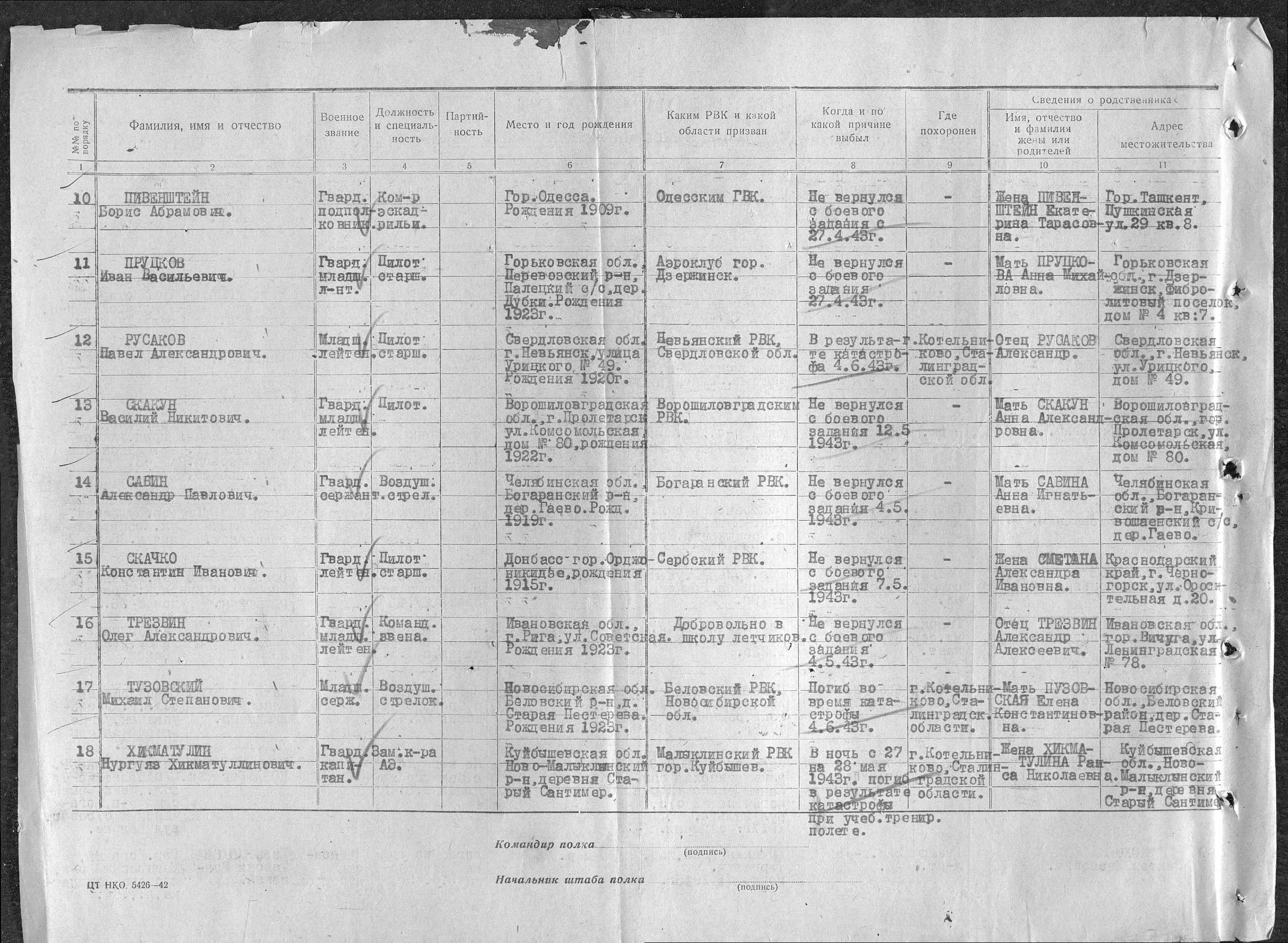 Причина выбытия не вернулся с боевого задания
