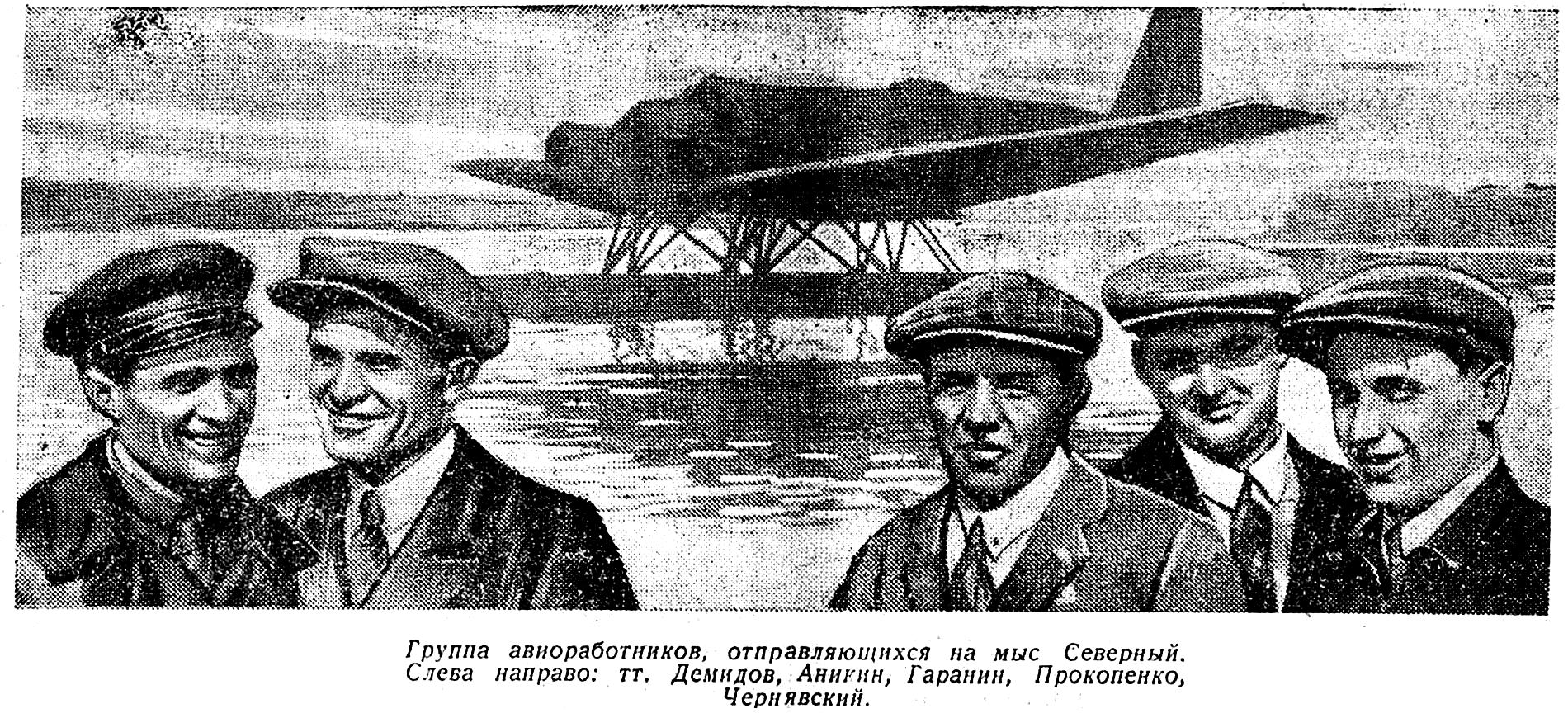 Группа авиоработников, отправляющихся на мыс Северный. Слева направо: тт. Демидов, Аникин, Гаранин, Прокопенко, Чернявский.