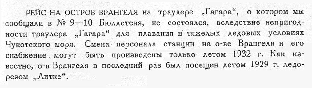 РЕЙС НА ОСТРОВ ВРАНГЕЛЯ на траулере "Гагара", о котором мы сообщали в № 9—10 Бюллетеня, не состоялся, вследствие непригодности траулера "Гагара" для плавания в тяжелых ледовых условиях Чукотского моря. Смена персонала станции на о-ве Врангеля и его снабжение могут быть произведены только летом 1932 г. Как известно, о-в Врангеля в последний раз был посещен летом 1929 г. ледорезом "Литке".