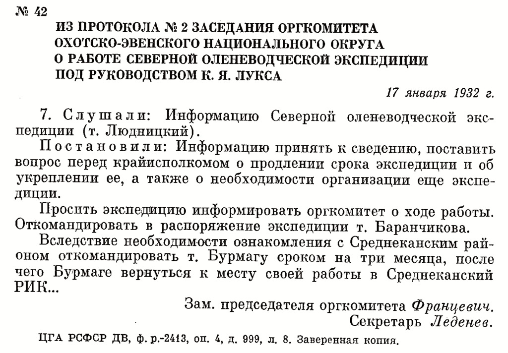ИЗ ПРОТОКОЛА № 2 ЗАСЕДАНИЯ ОРГКОМИТЕТА ОХОТСКО-ЭВЕНСКОГО НАЦИОНАЛЬНОГО ОКРУГА О РАБОТЕ СЕВЕРНОЙ ОЛЕНЕВОДЧЕСКОЙ ЭКСПЕДИЦИИ ПОД РУКОВОДСТВОМ К. Я. ЛУКСА