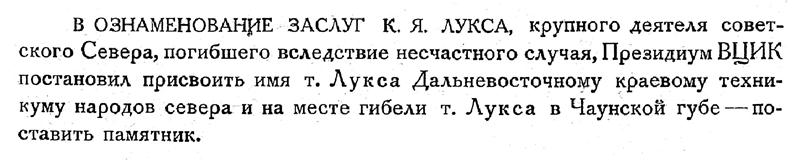 В ОЗНАМЕНОВАНИЕ ЗАСЛУГ К. Я. ЛУКСА, крупного деятеля советского Севера, погибшего вследствие несчастного случая, Президиум ВЦИК постановил присвоить имя т. Лукса Дальневосточному краевому техникуму народов севера и на месте гибели т. Лукса в Чаунской губе — поставить памятник.