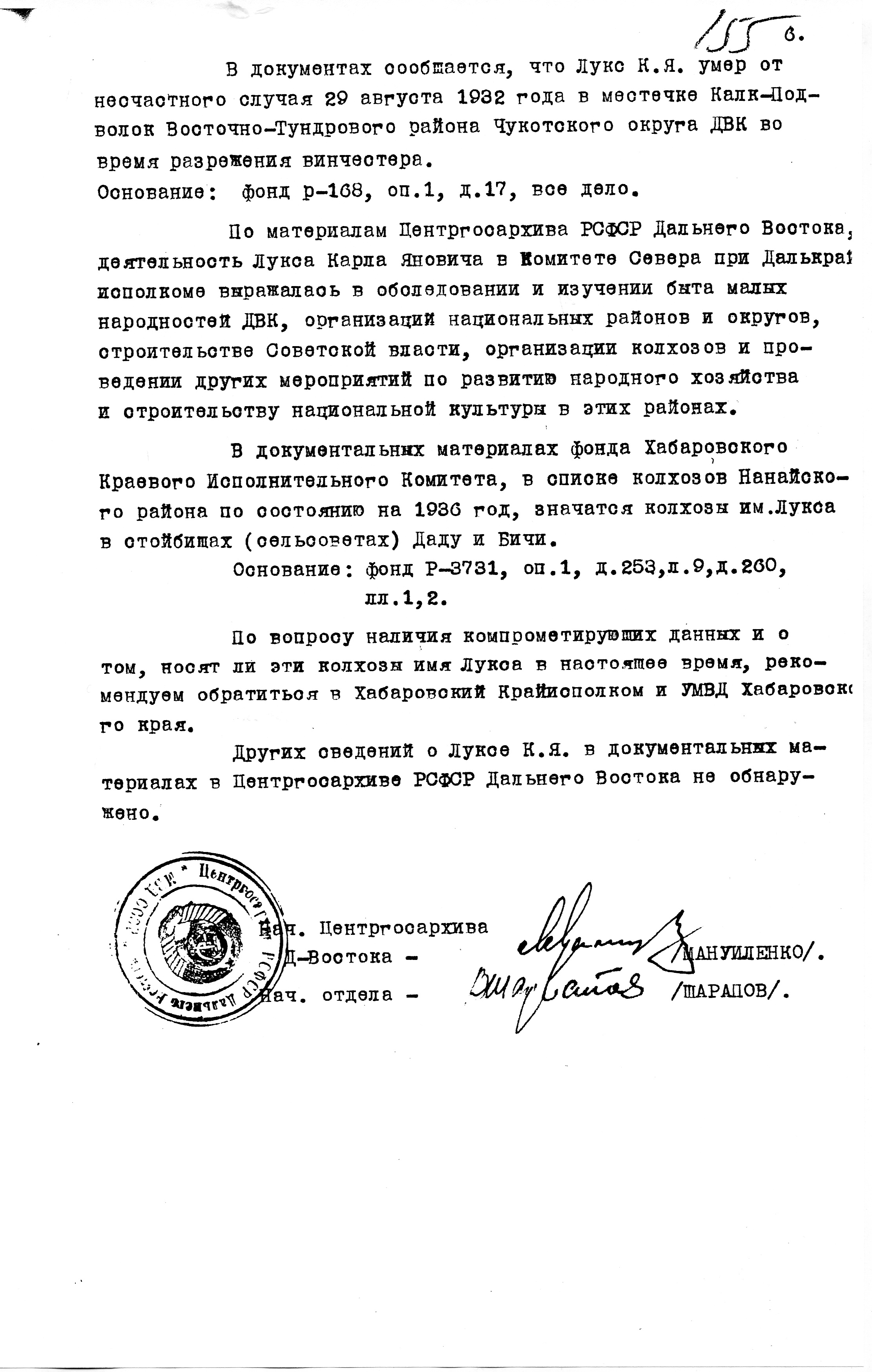080. Архивная справка ЦГА РСФСР Дальнего Востока №229 от 02.07.1955 о Луксе К.Я., составленная на запрос ВРИО старшего помощника военного прокурора ЛенВО, исх.№322 от 06.05.1955.