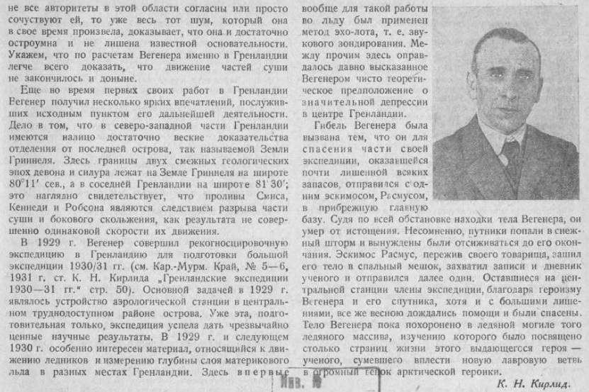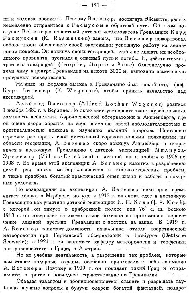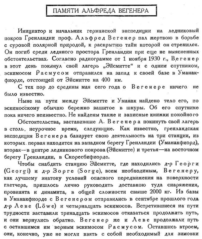 Инициатор и начальник германской экспедиции на ледниковый покров Гренландии проф. Альфред Вегенер пал жертвою в борьбе с суровой полярной природой, к раскрытию тайн которой он стремился. Он погиб среди ледяного простора Гренландии при еще не выясненных обстоятельствах. Согласно радиограмме от 1 ноября 1930 г., Вегенер в этот день покинул свой лагерь „Эйсмитте" и с одним спутником, эскимосом Расмусом отправился на запад к своей базе в Уманак-фиорде, отстоящей от Эйсмитте на 400 км.