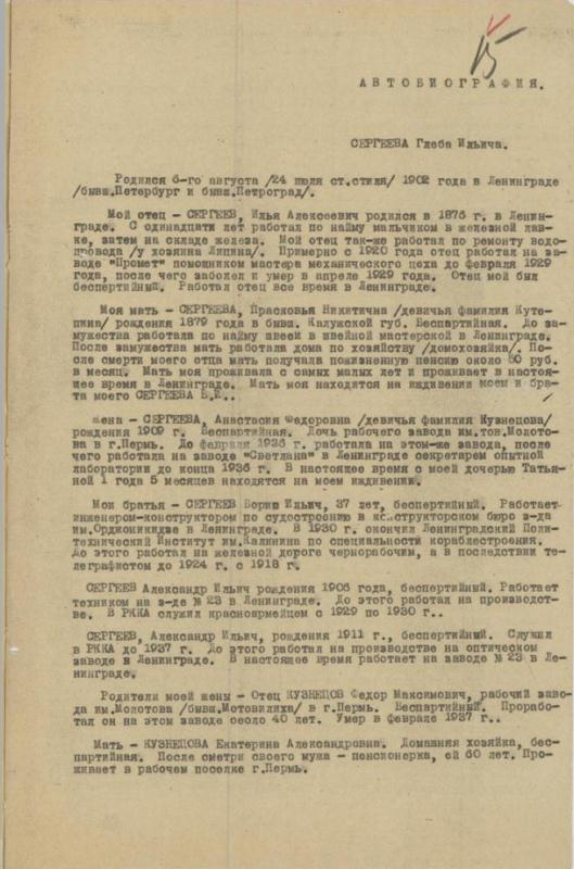 Моя мать - СЕРГЕЕВА, Прасковья Никитична /девичья фамилия Кутепина/ рождения 1879 года в бывш. Калужской губ. Беспартийная. До замужества работала по найму швеей в швейной мастерской в Ленинграде. После замужества мать работала дома по хозяйству /домохозяйка/. После смерти моего отца мать получала пожизненную пенсию около 50 руб. в месяц. Мать моя проживала с самых малых лет и проживает в настоящее время в Ленинграде. Мать моя находятся на иждивении моем и брата моего СЕРГЕЕВА Б. И.