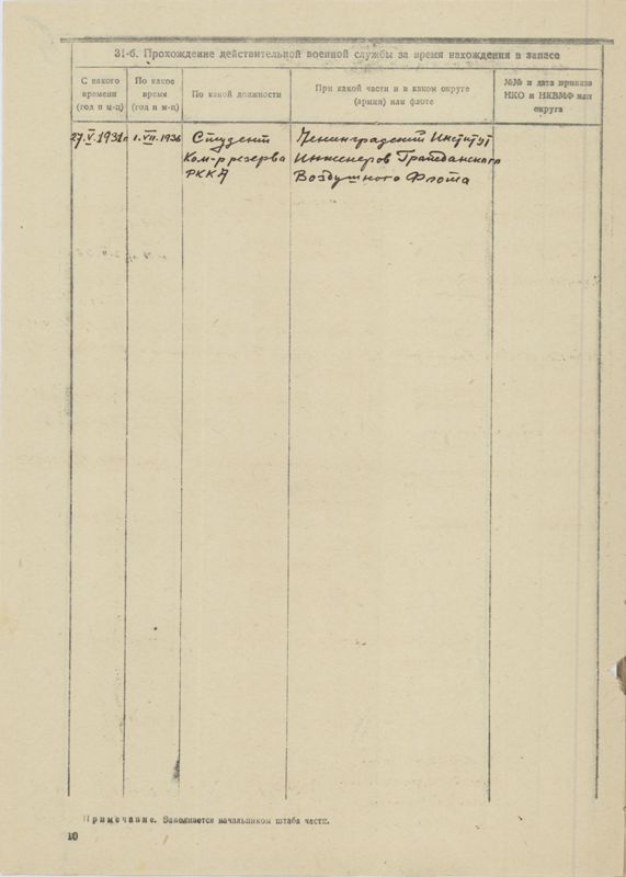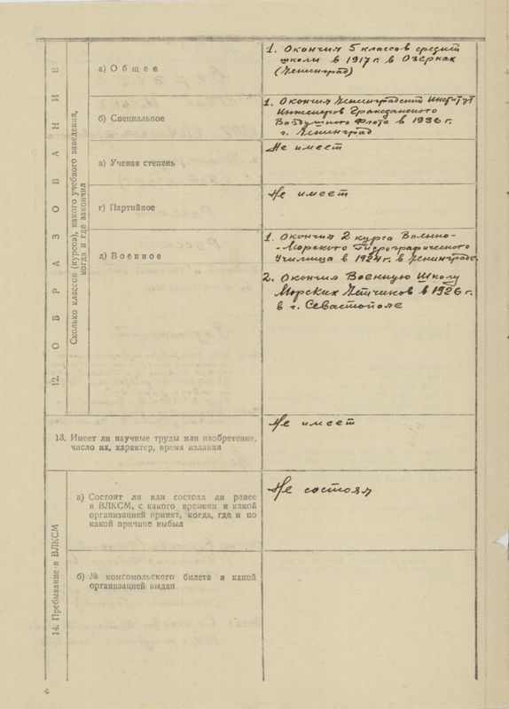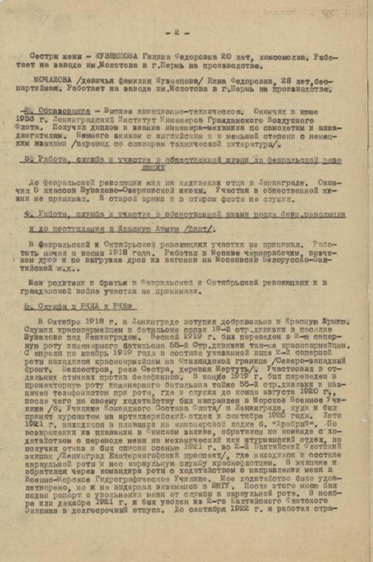 2. Образование - Высшее авиационно-техническое. Окончил в июне 1936 г. Ленинградский институт Инженеров Гражданского Воздушного Флота. Получил диплом и звание инженера-механика по самолетам и авиадвигателям. Немного знаком с английским и в меньшей степени с немецким языками /перевод со словарем технической литературы/.