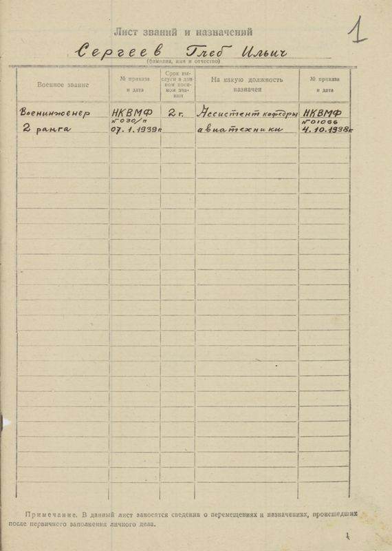 С января 1930 г. был назначен в 62-ю Отдельную Авиационную эскадрилью ВВС БМ, где и работал старшим летчикам и командиром корабля до апреля 1931 г. /Ленинград, Гребной Порт/. В апреле 1931 г. я был назначен инструктором-летчиком в военную школу морских летчиков в г. Севастополь, но имея желание пополнить свои теоретические авиационные знания обратился с ходатайством в штаб ВВС PККA о направление меня на учебу в Ленинградский Институт Инженеров ГВФ., где я начал заниматься по вечерам и в свободное от службы время с конца 1930 г. В мае 1931 г. я был переведен в резерв РККА и направлен в Главное Управление Гражданского Воздушного Флота, откуда меня направили в Ленинградский Институт Инженеров ГВФ., где и обучался в дальнейшем. В 1932 г. был командирован в экспедицию по изысканию морских и сухопутных аэродромов в Большеземельской тундре, где и работал начальником разведывательной и геодезической партии до осени 1932 г. Во время своего летнего отпуска в 1934 г. работал морским летчиком на воздушной линии в Восточной Сибири /г. Иркутск, реки Ангара и Лена/. Так же тренировался в полетах в Ленинграде на аэродроме Северного Управления ГВФ /ст. Шоссейная Варшавской ж. д. /. В июне 1936 г. окончил Ленинградский Институт Инженеров ГВФ. 1 июля 1936 г. приказом НКО был переведен из резерва в кадры PККA и назначен в Научно-Испытательный Институт Морской Авиации, куда и прибыл в августе 1936 г. /г. Севастополь, бухта Константиновская/. 3десь я работал инженером по испытанию гидросамолетов и летчиком испытателем до конца октября 1938 г. Приказом НК ВМФ в октябре 1938 г. я был назначен ассистентом командно-авиационного факультета Военно-Морской Академии им. тов. Ворошилова, где и работаю в настоящее время.