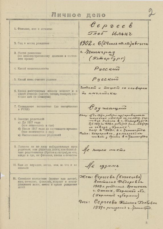 Жена - СЕРГЕЕВА, Анастасия Федоровна /девичья фамилия Кузнецова/ рождения 1909 г. беспартийная. Дочь рабочего завода им. тов. Молотова в г. Пермь. До февраля 1936 г. работала на этом-же заводе, после чего работала на заводе "Светлана" в Ленинграде секретарем опытной лаборатории до конца 1933 г. В настоящее время с моей дочерью Татьяной 1 года 5 месяцев находятся на моем иждивении.