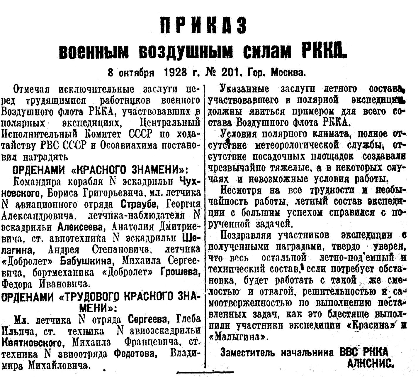 Указанные заслуги летного состава участвовавшего в полярной экспедиции, должны явиться примером для всего состава Воздушного флота РККА.