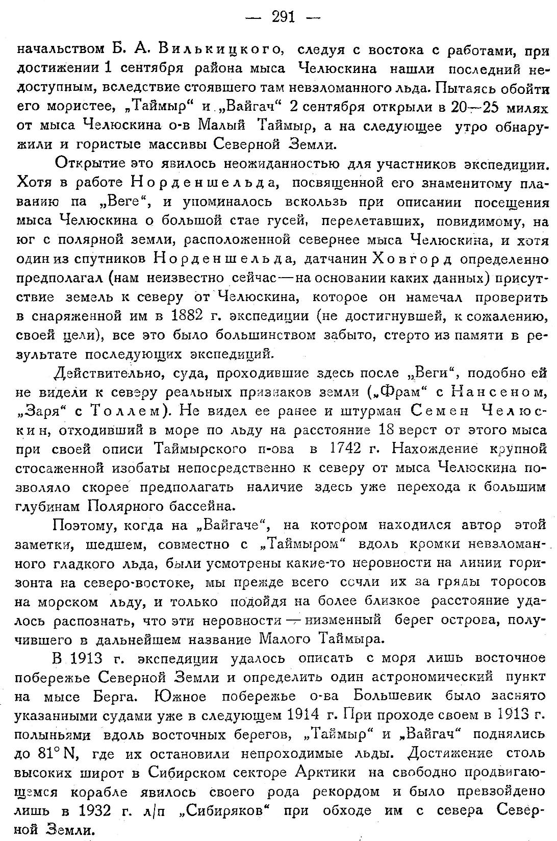 В 1913 г. экспедиции удалось описать с моря лишь восточное побережье Северной Земли и определить один астрономический пункт на мысе Берга. Южное побережье о-ва Большевик было заснято указанными судами уже в следующем 1914 г. При проходе своем в 1913 г. полыньями вдоль восточных берегов, „Таймыр" и „Вайгач" поднялись до 81° N, где их остановили непроходимые льды. Достижение столь высоких широт в Сибирском секторе Арктики на свободно продвигающемся корабле явилось своего рода рекордом и было превзойдено лишь в 1932 г. л/п „Сибиряков" при обходе им с севера Северной Земли.