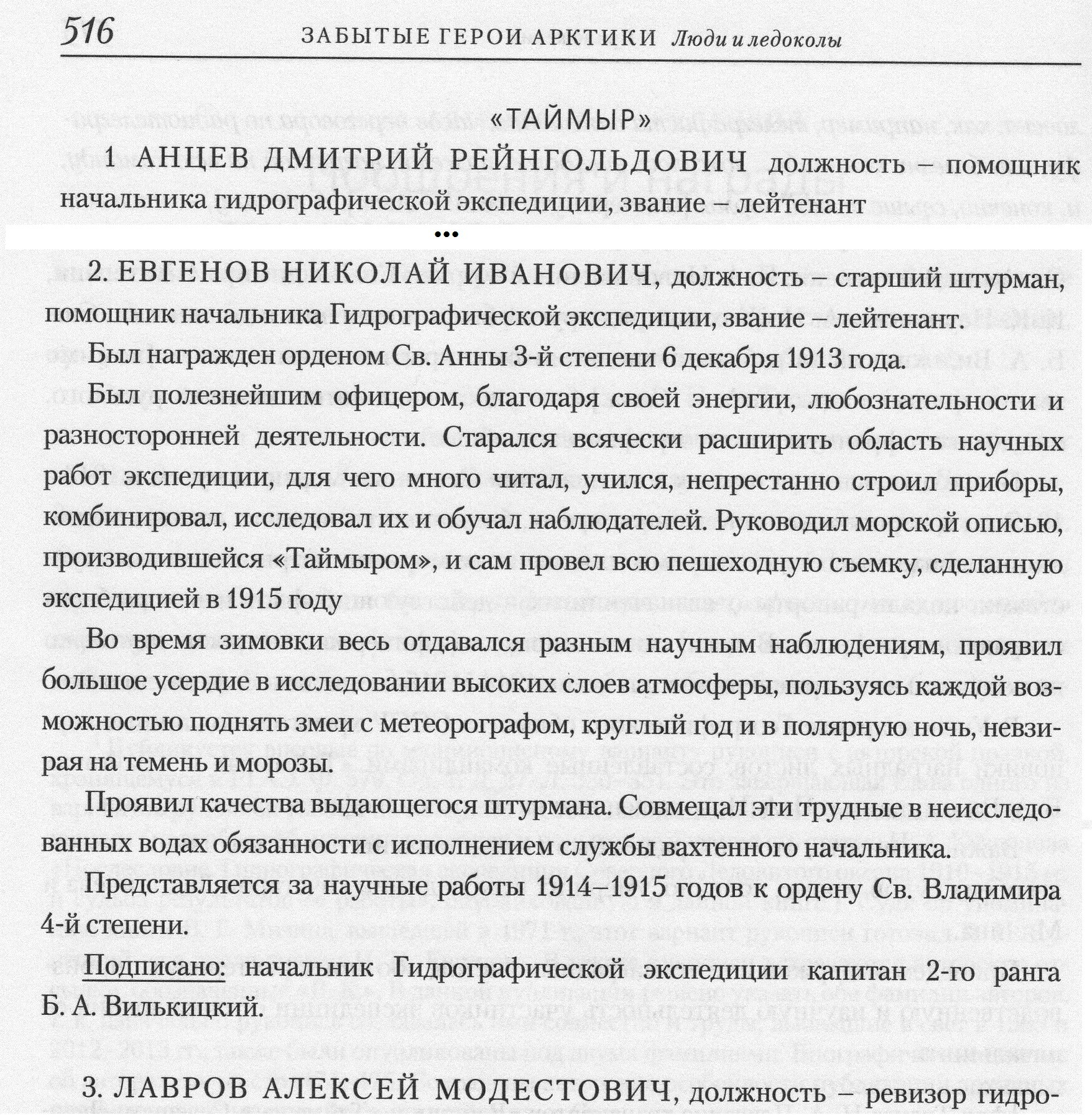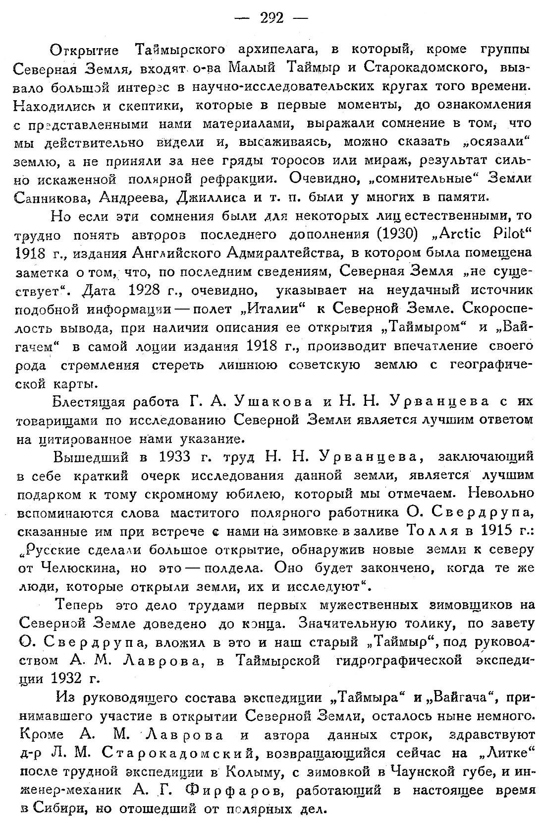 Из руководящего состава экспедиции „Таймыра" и „Вайгача", принимавшего участие в открытии Северной Земли, осталось ныне немного. Кроме А. М. Лаврова и автора данных строк, здравствуют д-р Л. М. Старокадомский, возвращающийся сейчас на „Литке" после трудной экспедиции в Колыму, с зимовкой в Чаунской губе, и инженер-механик А. Г. Фирфаров, работающий в настоящее время в Сибири, но отошедший от полярных дел.