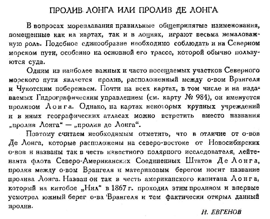 Одним из наиболее важных и часто посещаемых участков Северного морского пути является пролив, расположенный между о-вом Врангеля и Чукотским побережьем. Почти на всех картах, в том числе и на издаваемых Гидрографическим управлением (см. карту № 984), он именуется проливом Лонга. Однако, на картах некоторых крупных учреждений и в иных географических атласах можно встретить вместо названия „пролив Лонга" — „пролив де Лонга".