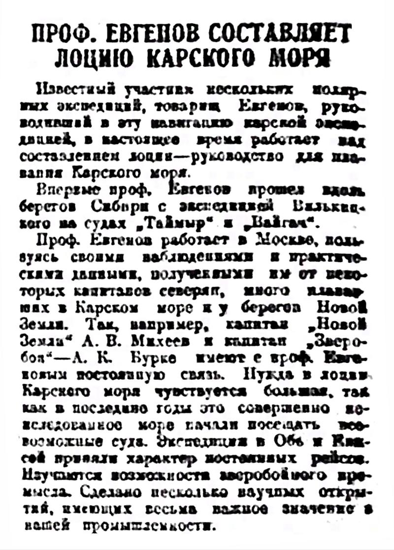 Известный участник нескольких полярных экспедиций товарищ Евгенов, руководивший в эту навигацию карской экспедицией, в настоящее время работает над составлением лоции — руководство для плавания Карского моря.