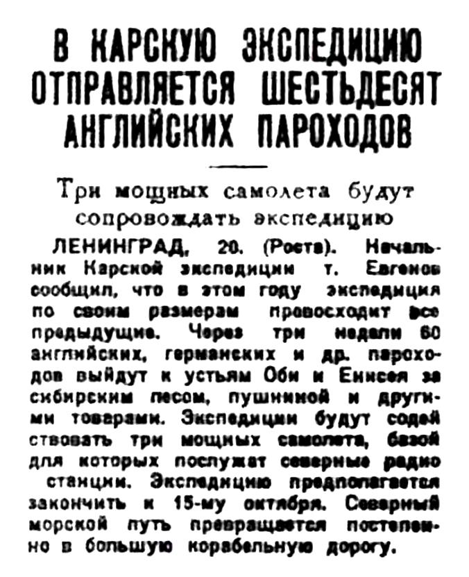 ЛЕНИНГРАД, 20. (Роста). Начальник Карской экспедиции т. Евгенов сообщил, что в этом году экспедиция по своим размерам превосходит все предыдущие. Через три недели 60 английских, германских и др. пароходов выйдут к устьям Оби и Енисея за сибирским лесом, пушниной и другими товарами. Экспедиции будут содействовать три мощных самолета, базой для которых послужат северные радио-станции. Экспедицию предполагается закончить к 13-му октября. Северный морской путь превращается постепенно в большую корабельную дорогу.