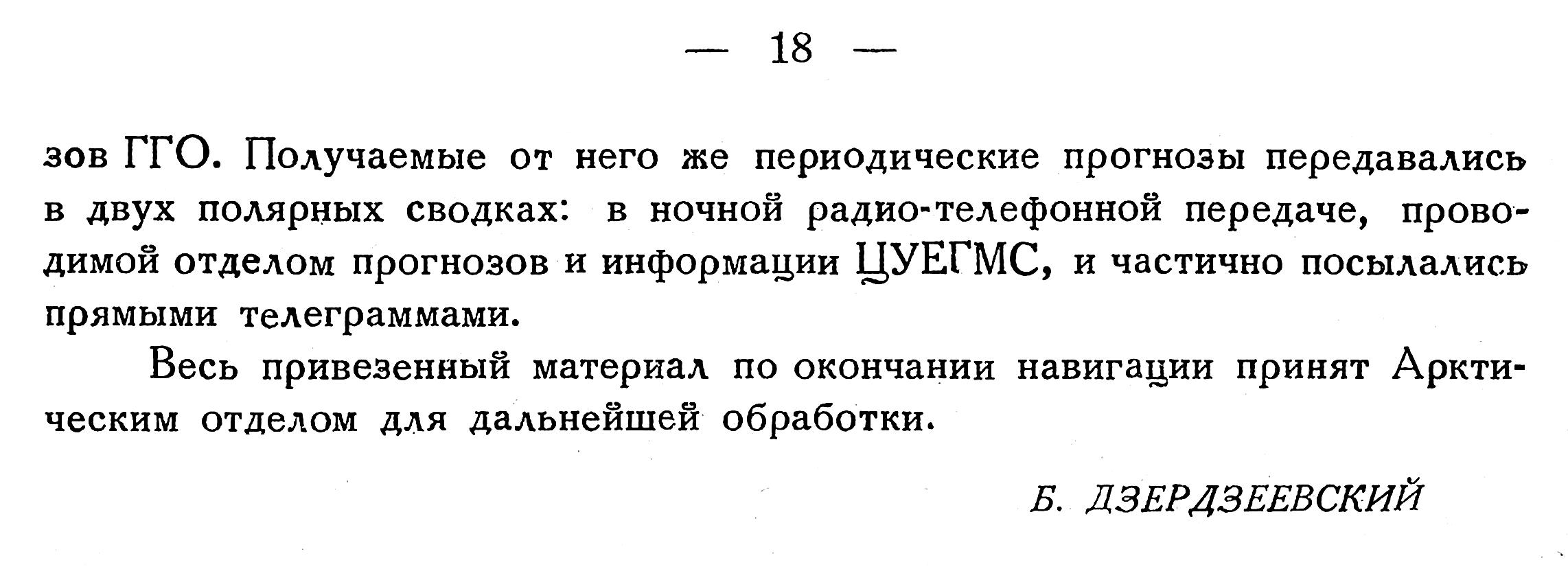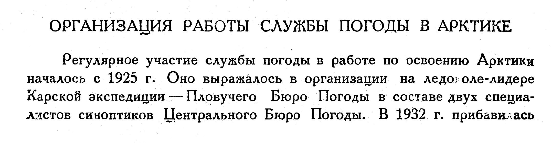 Опыт этого года и ставшая постоянной практика приглашения синоптиков для обслуживания всех спорадических походов (походы „Красина" 1928, 1932 и 1933 гг. и др.) побудило Центр Бюро Погоды к выделению специальной арктической ячейки.