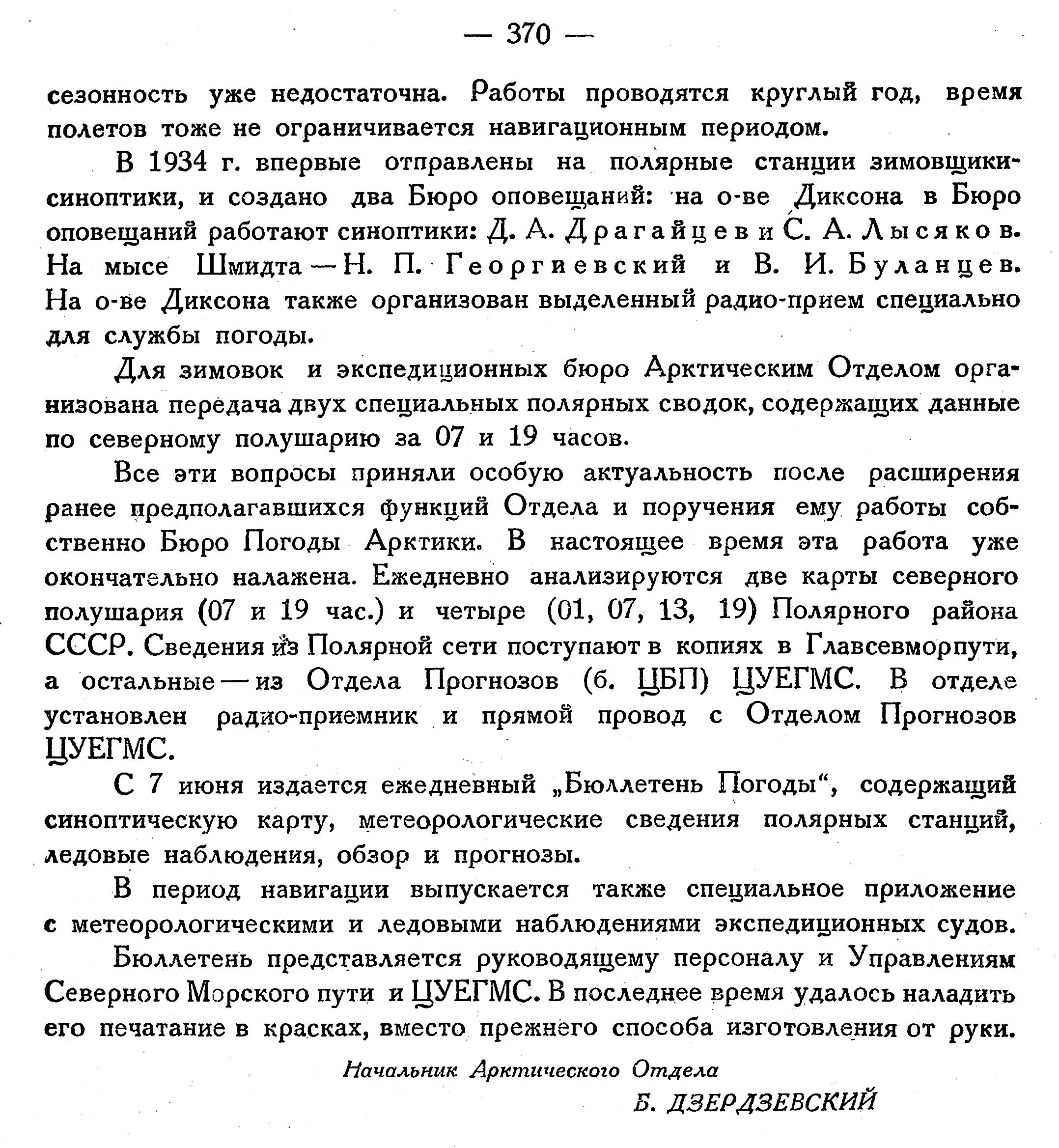 В 1934 г. впервые отправлены на полярные станции зимовщики-синоптики, и создано два Бюро оповещаний: на о-ве Диксона в Бюро оповещаний работают синоптики: Д. А. Драгайцев и С. А. Лысяков. На мысе Шмидта — Н. П. Георгиевский и В. И. Буланцев. На о-ве Диксона также организован выделенный радио-прием специально для службы погоды.