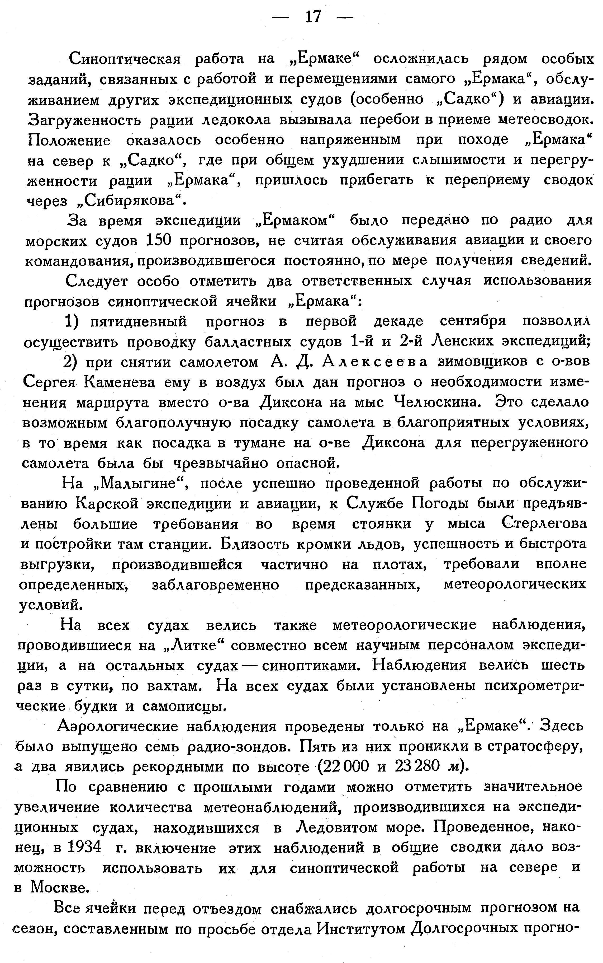За время экспедиции „Ермаком" было передано по радио для морских судов 150 прогнозов, не считая обслуживания авиации и своего командования, производившегося постоянного мере получения сведений.