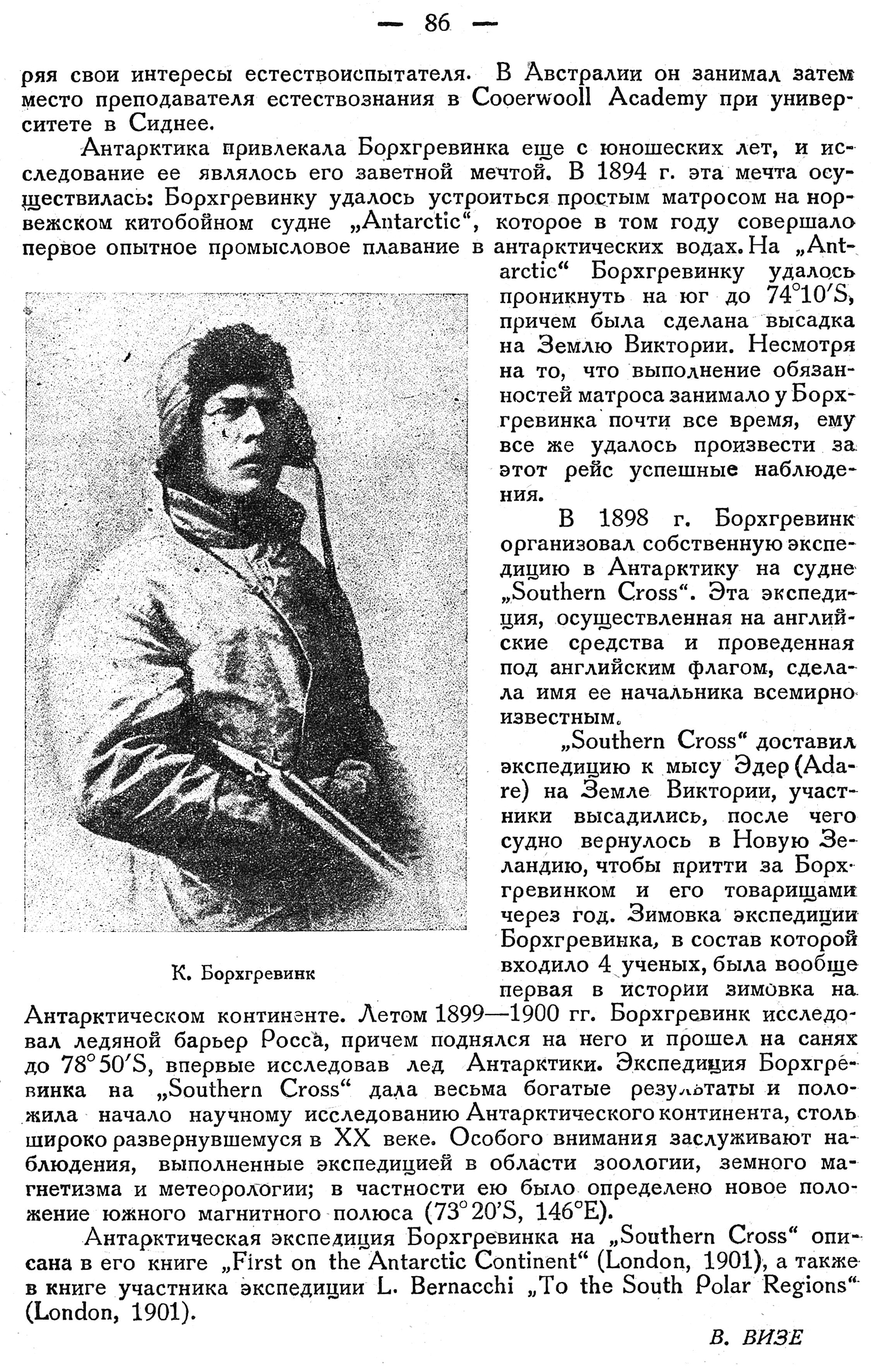 (Borchgrevink, в 1864 г.) — норвежский путешественник. В 1894 г., желая ознакомиться с полярными странами, поступил матросом на норвежское китоловное судно, отправлявшееся из Мельбурна к Земле Виктории, в Южн. Ледовитом океане. В 1898 г. он на судне "Southern Cross" отправился из Лондона, 17 февраля 1899 г. высадился у мыса Адаре (Земля Виктории) с десятью спутниками, перезимовал там и в следующем году отправился в открытую Джемсом Россом бухту, западнее Земли Виктории. Оттуда на санях он отправился далее на юг и достиг наибольшей южной широты (78°50'). В марте 1900 г. экспедиция вернулась в Новую Зеландию, добыв важные данные для установления положения южного магнитного полюса. О своем путешествии Б. напечатал книгу: "First on the Antarctic Continent" (Лондон, 1901).