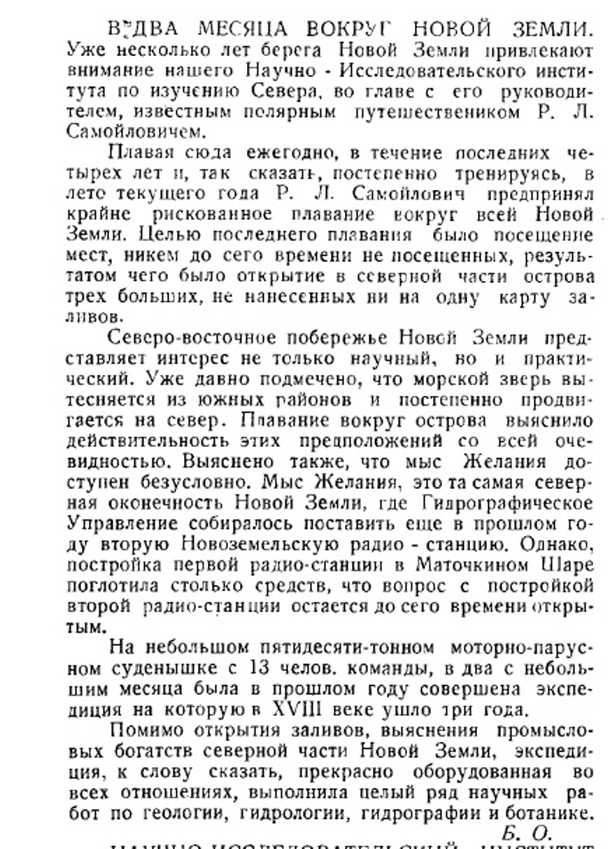 Естественно, что такая задача может быть осуществлена лишь при тесном контакте с местными научно-исследовательскими правительственными и общественными организациями. Поэтому в положении института предусмотрены отделы „европейский, сибирский и дальневосточный". Но так как многие работы института не смогут уложиться в территориальные рамки этих отделов, то при институте имеется еще один весьма важный „отдел морских и воздушных экспедиций".