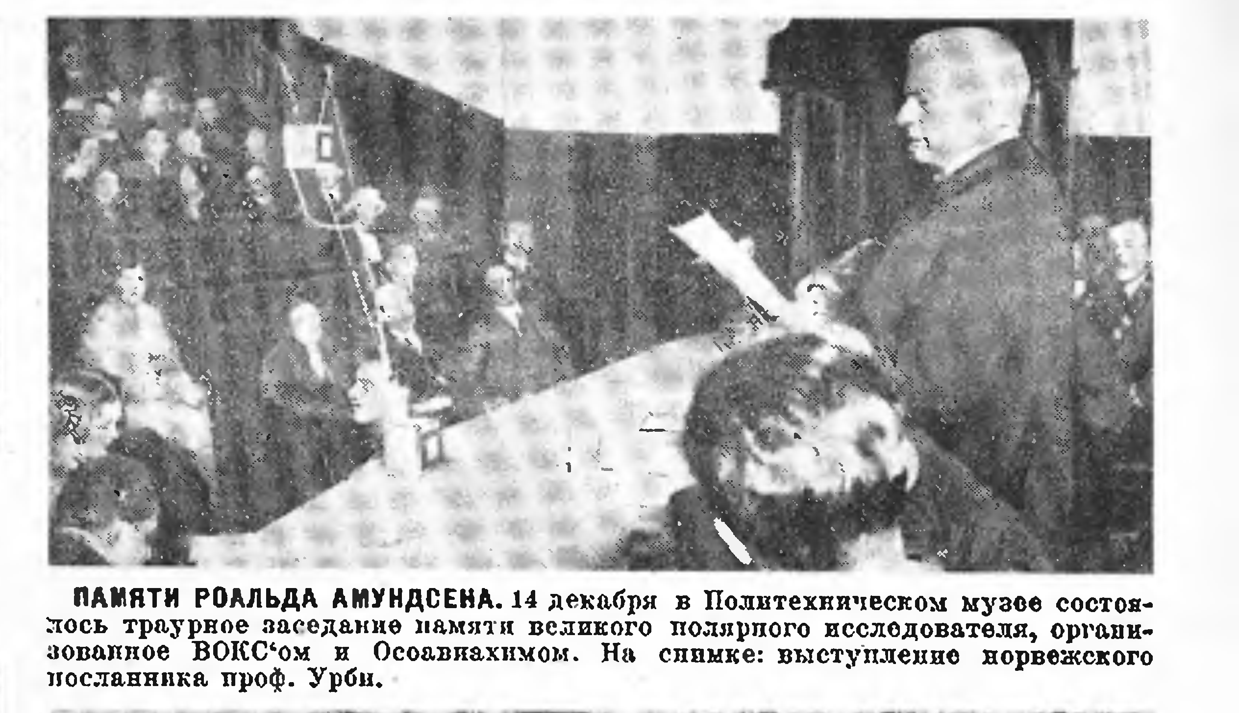 ВЕЧЕР ПАМЯТИ РУАЛА АМУНДСЕНА. Арктическим институтом был организован 14 декабря (в день 20-летия достижения Р. Амундсеном южного полюса) закрытый вечер, посвященный памяти исследователя. Был исполнен траурный марш. С речами выступили: Р. Л. Самойлович (вступительное слово), В. Ю. Визе („Амундсен как научный исследователь"), Н. В. Пинегин („Амундсен как полярный исследователь") и М. А. Дьяконов, переводчик всех книг Р. Амундсена на русский язык („Амундсен и Норвегия"). Первая часть вечера, с докладами и траурным маршем, передавалась по эфиру.