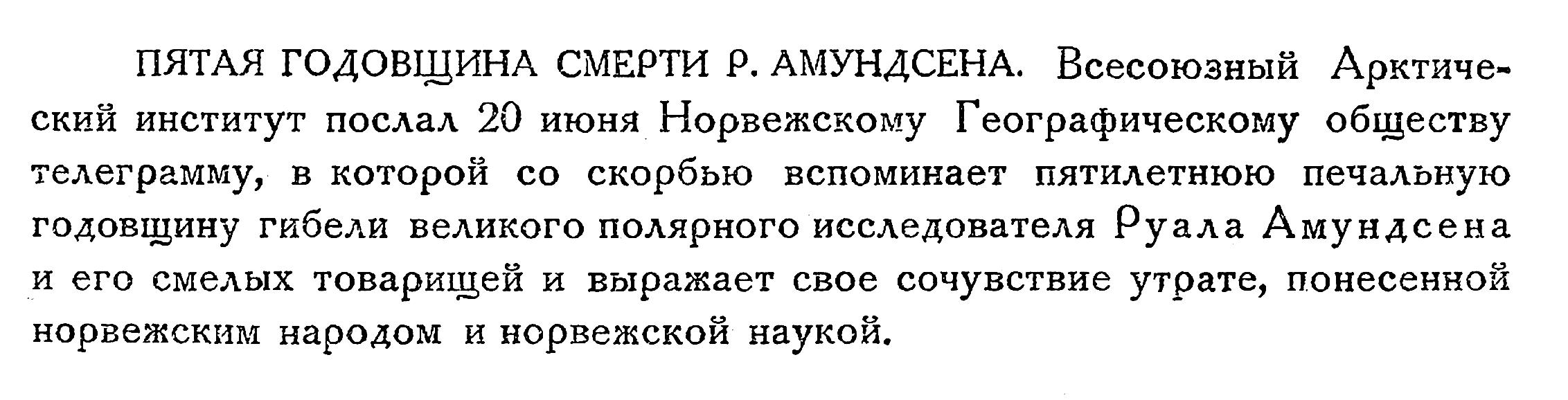 ПЯТАЯ ГОДОВЩИНА СМЕРТИ Р. АМУНДСЕНА. Всесоюзный Арктический институт послал 20 июня Норвежскому Географическому обществу телеграмму, в которой со скорбью вспоминает пятилетнюю печальную годовщину гибели великого полярного исследователя Руала Амундсена и его смелых товарищей и выражает свое сочувствие утрате, понесенной норвежским народом и норвежской наукой.