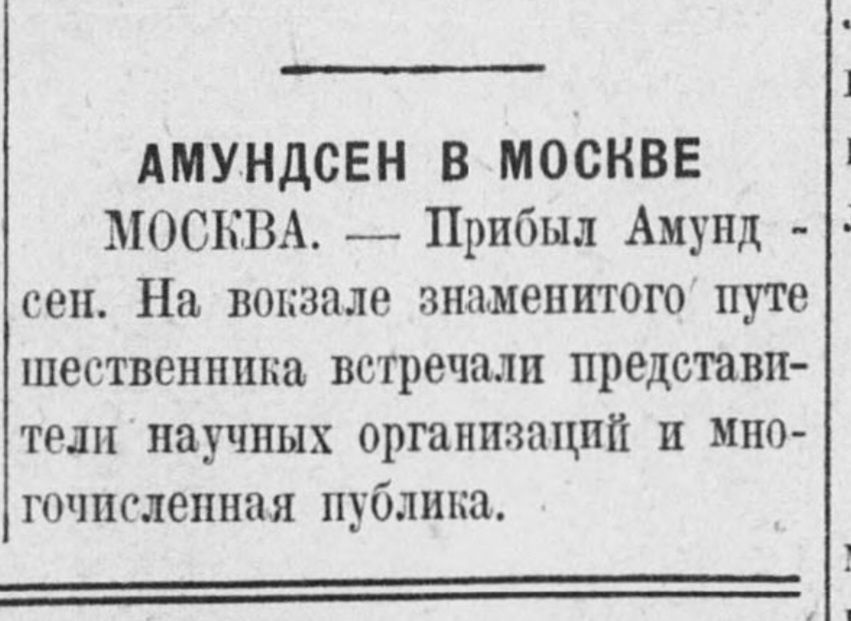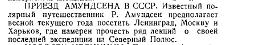 Известный полярный путешественник Р. Амундсен предполагает весной текущего года посетить Ленинград, Москву и Харьков, где намерен прочесть ряд лекций о своей последней экспедиции на Северный Полюс.