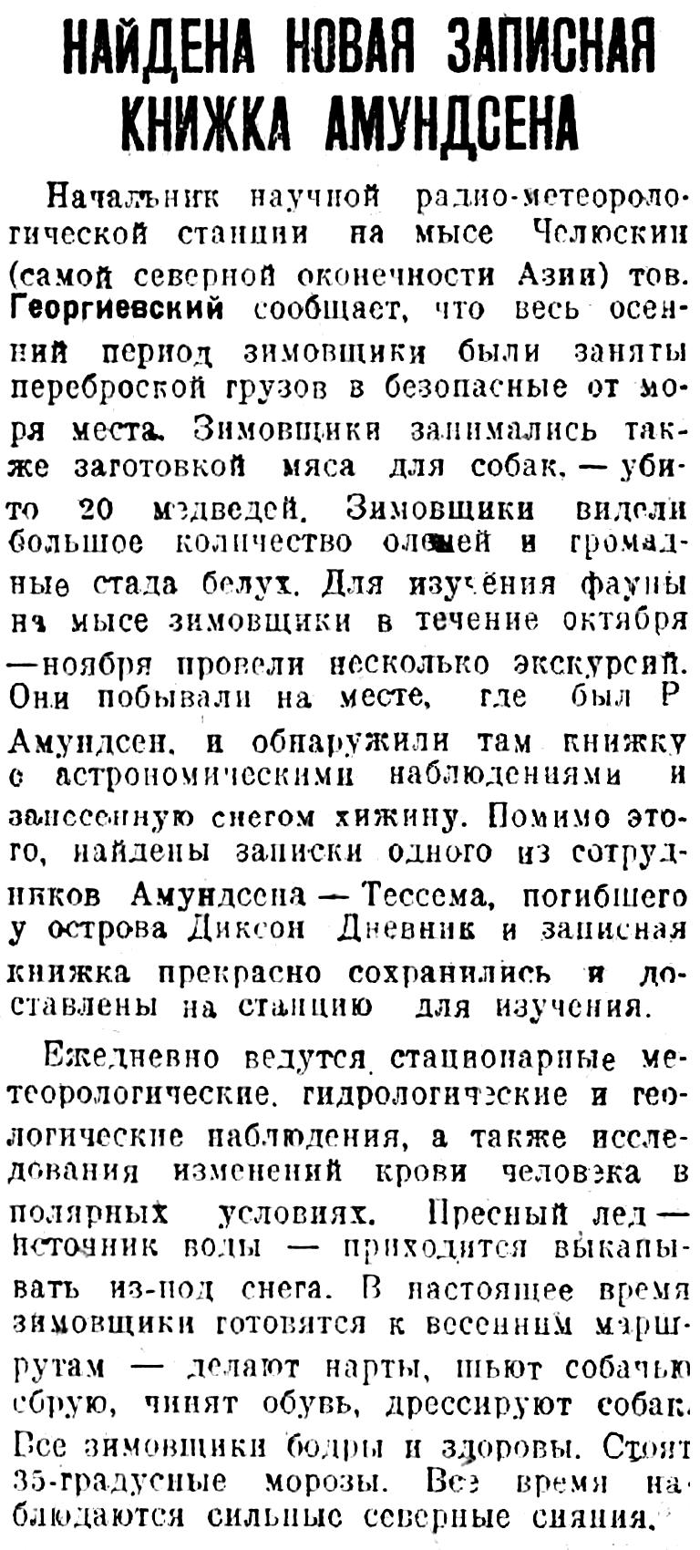 Начальник научной радио-метеорологической станции на мысе Челюскин (самой северной оконечности Азии) тов. Георгиевский сообщает, что весь осенний период зимовщики были заняты переброской грузов в безопасные от моря места. Зимовщики занимались также заготовкой мяса для собак, — убито 20 медведей. Зимовщики видели большое количество оленей и громадные стада белух. Для изучения фауны на мысе зимовщики в течение октября — ноября провели несколько экскурсий. Они побывали на месте, где был Р. Амундсен, и обнаружили там книжку с астрономическими наблюдениями и занесенную снегом хижину. Помимо этого, найдены записки одного из сотрудников АмундсенаТессема, погибшего у острова Диксон. Дневник и записная книжка прекрасно сохранились и доставлены на станцию для изучения.