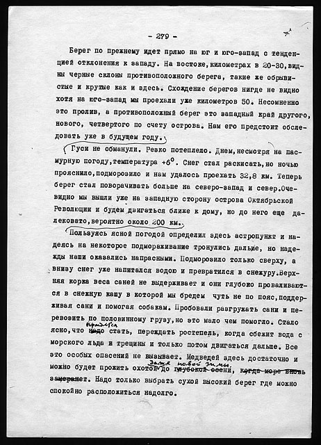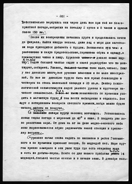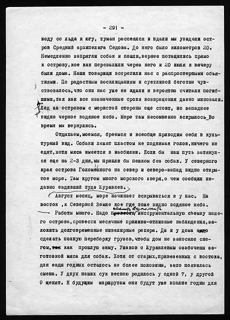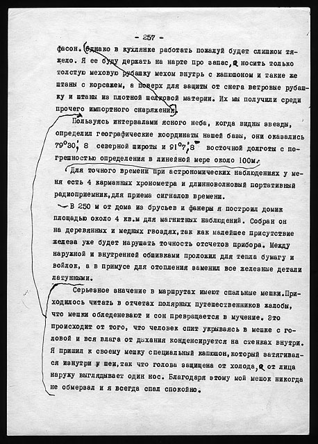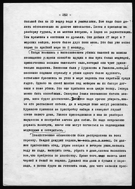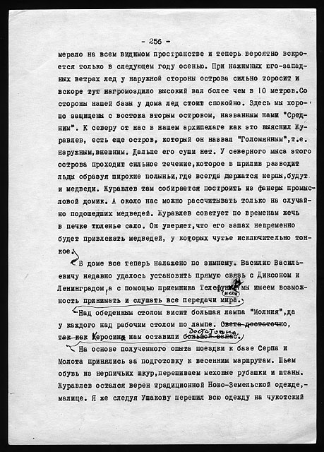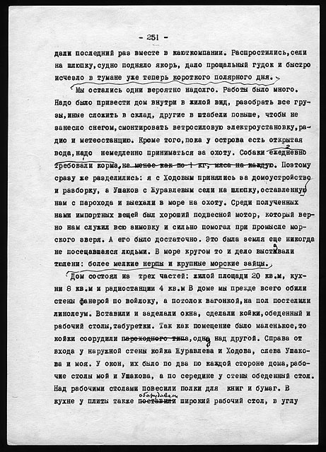 Этого типа дом был весьма удобен для жилья и очень тепел. За весь период двухгодичной зимовки заслонка печной трубы ни разу не закрывалась даже на ночь, из соображений вентиляции. Форточка в кухне бывала открыта целыми часами, да нередко и выходная дверь, и все же температура утром в доме никогда не падала ниже +8° в самые сильные морозы и пурги.