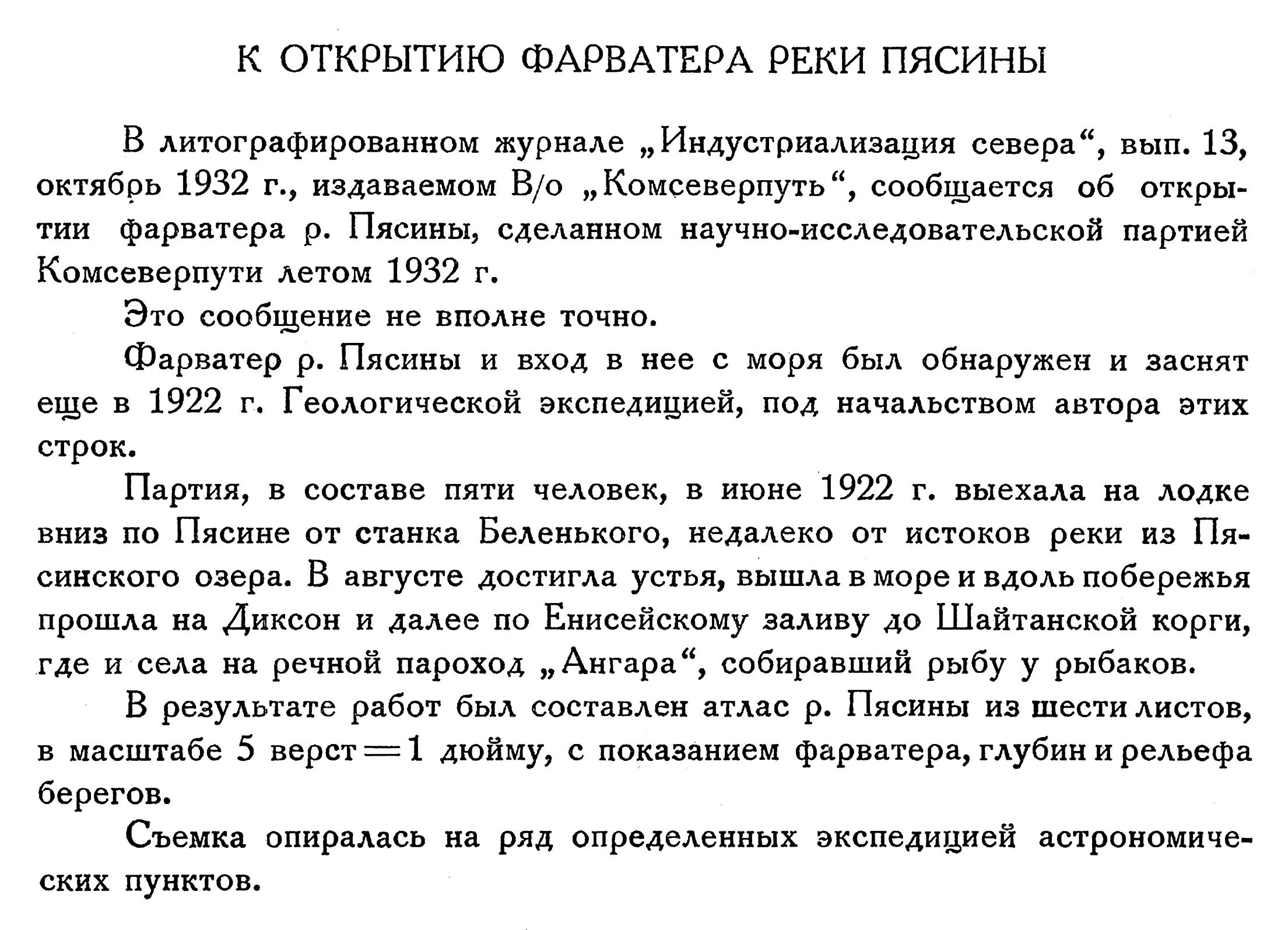 В литографированном журнале „Индустриализация севера", вып. 13, октябрь 1932 г., издаваемом В/о „Комсеверпуть", сообщается об открытии фарватера р. Пясины, сделанном научно-исследовательской партией Комсеверпути летом 1932 г.