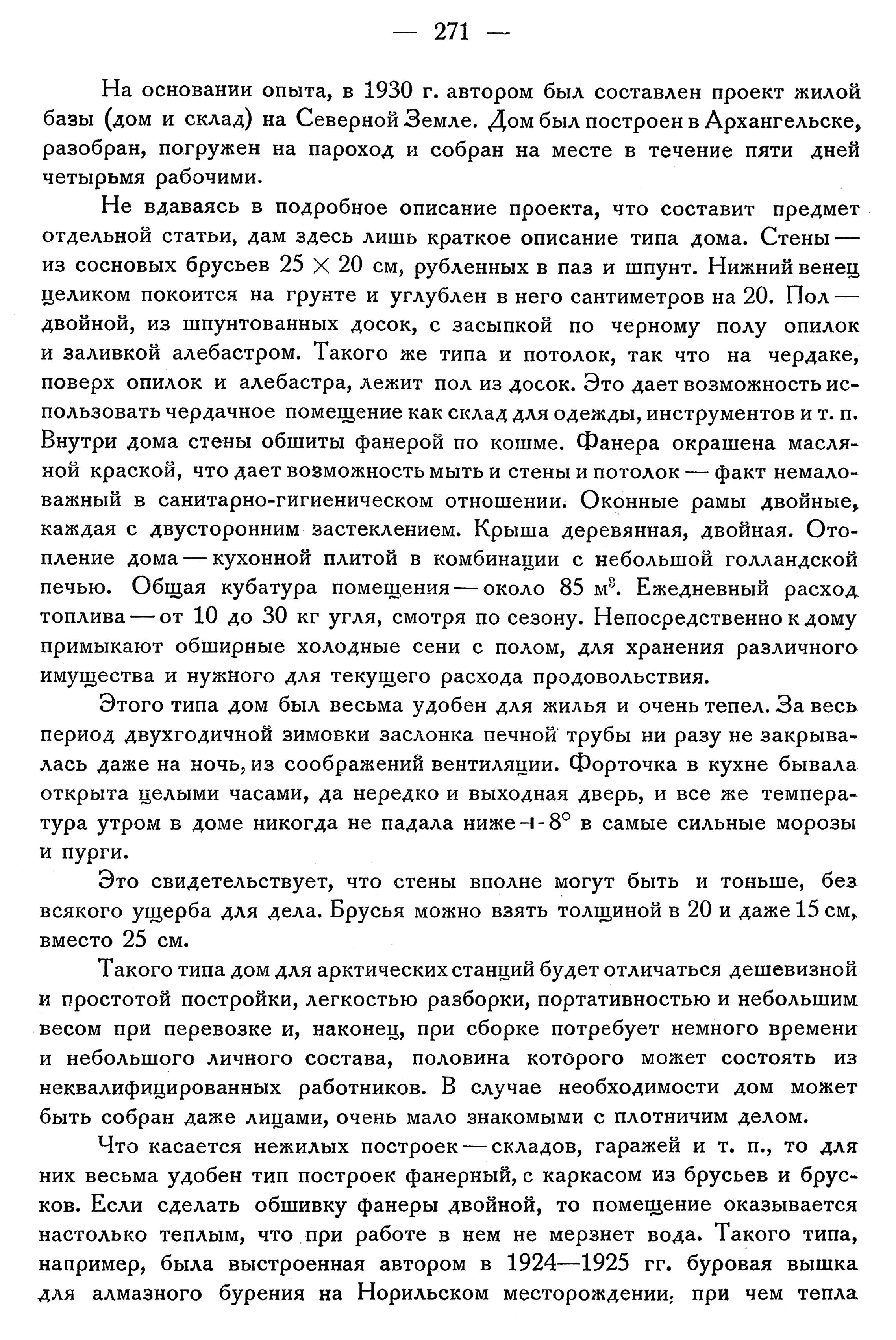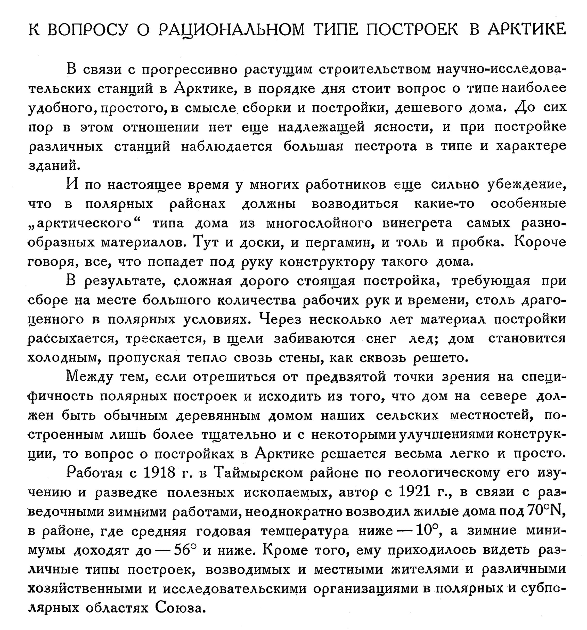 Работая с 1918 г. в Таймырском районе по геологическому его изучению и разведке полезных ископаемых, автор с 1921 г., в связи с разведочными зимними работами, неоднократно возводил жилые дома под 70°N, в районе, где средняя годовая температура ниже —10°, а зимние минимумы доходят до — 56° и ниже. Кроме того, ему приходилось видеть различные типы построек, возводимых и местными жителями и различными хозяйственными и исследовательскими организациями в полярных и субполярных областях Союза.