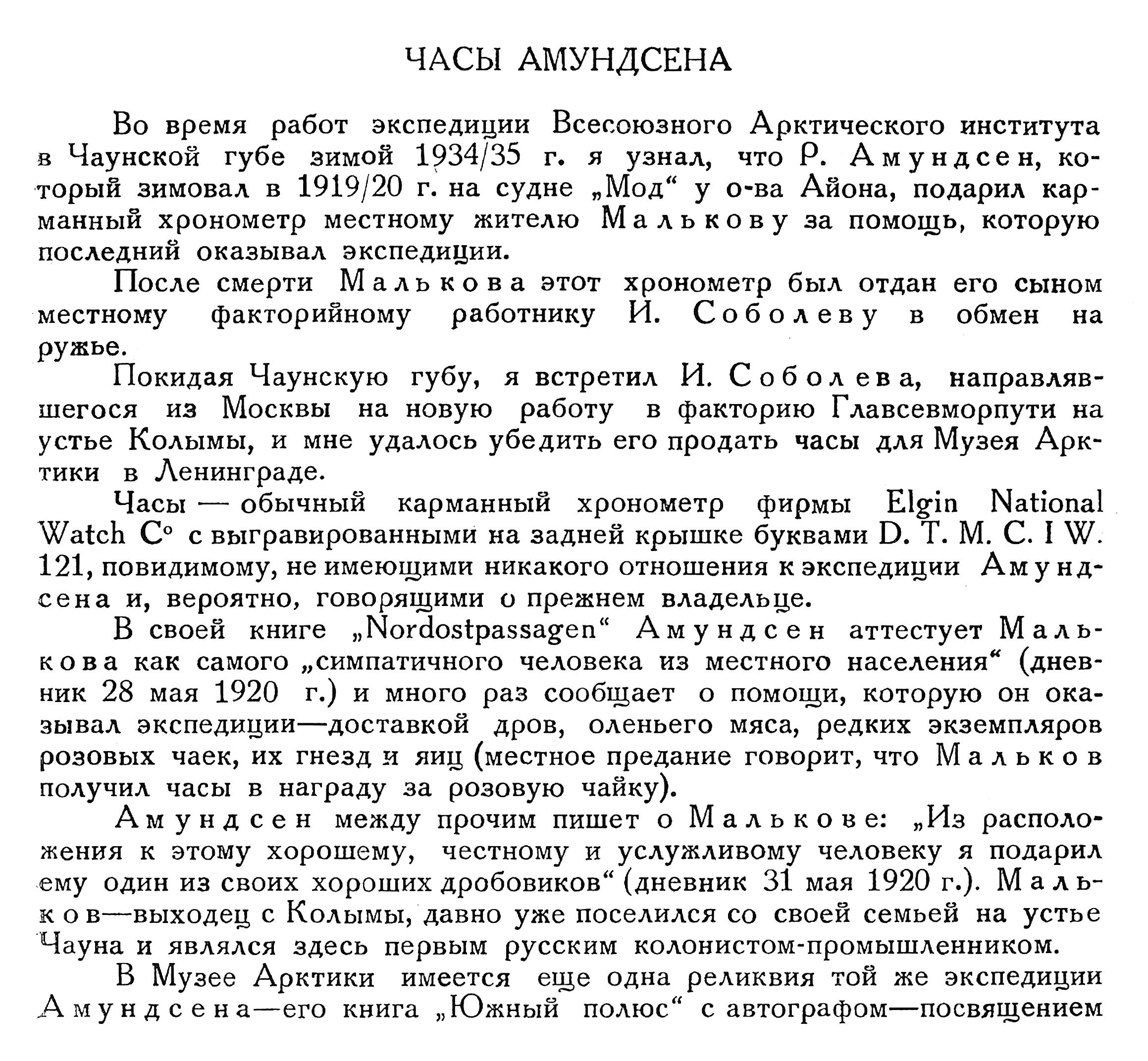 Во время работ экспедиции Всесоюзного Арктического института в Чаунской губе зимой 1934/35 г. я узнал, что Р. Амундсен, который зимовал в 1919/20 г. на судне „Мод“ у о-ва Айона, подарил карманный хронометр местному жителю Малькову за помощь, которую последний оказывал экспедиции.