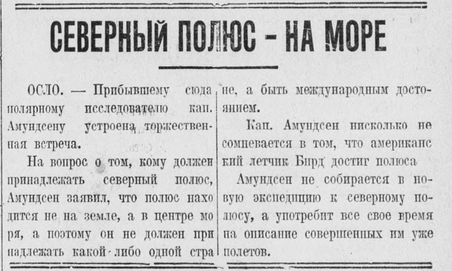 Известный полярный путешественник Р. Амундсен предполагает весной текущего года посетить Ленинград, Москву и Харьков, где намерен прочесть ряд лекций о своей последней экспедиции на Северный Полюс.