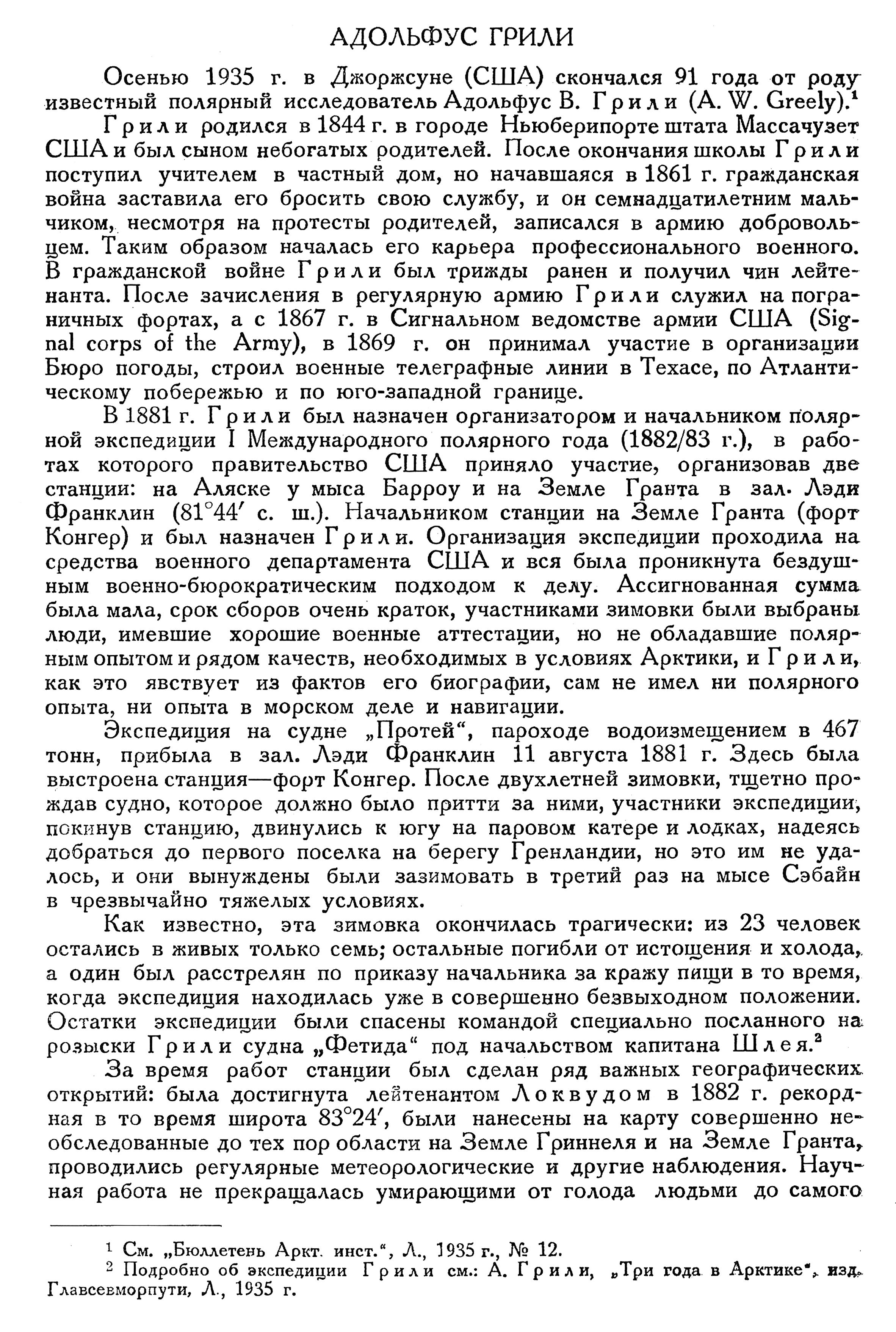 конца. В этой экспедиции как сам Грили, так и некоторые его сотрудники показали высокий личный героизм и мужество. Трагическому исходу экспедиции способствовало угнетенное моральное состояние ее участников, думавших, что на родине их забыли.