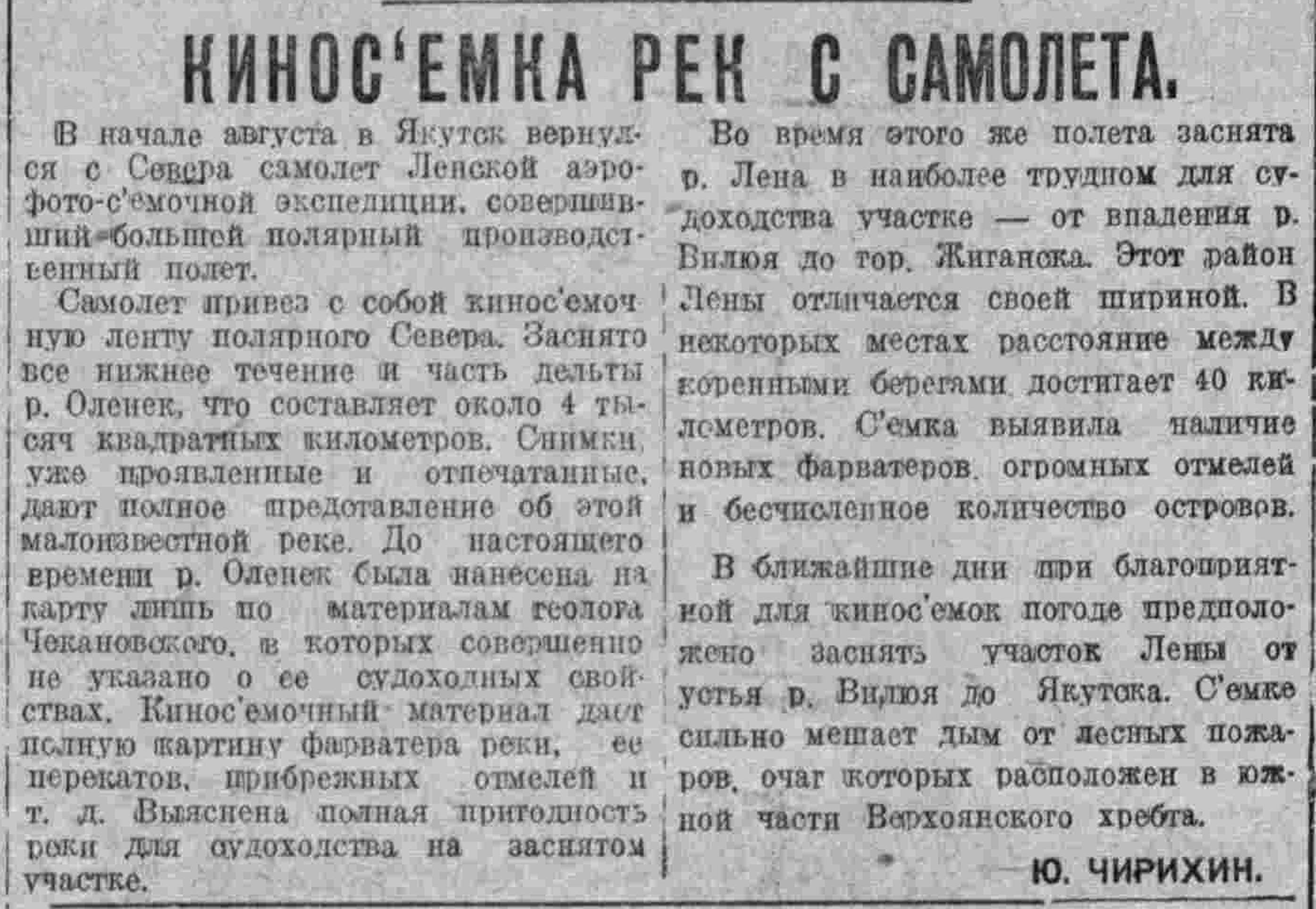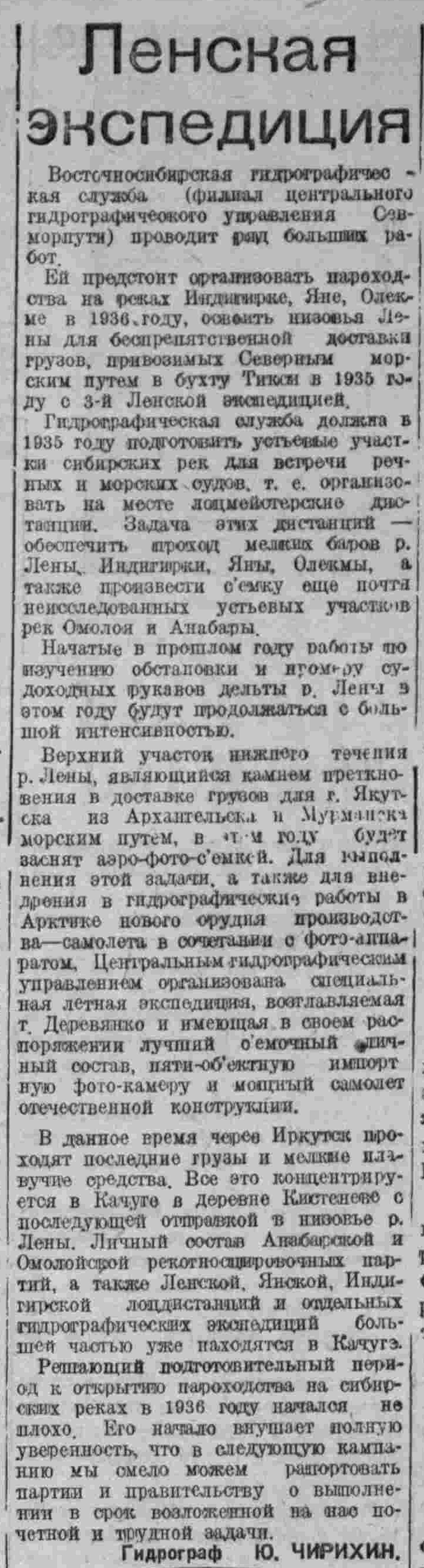 Верхний участок нижнего течения р. Лены, являющийся камнем преткновения в доставке грузов для г. Якутска из Архангельска и Мурманска морским путем, в этом году будет заснят аэрофотосъемкой. Для выполнения этой задачи, а также для внедрения в гидрографические работы в Арктике нового орудия производства — самолета в сочетании о фотоаппаратом. Центральным гидрографическим управлением организована специальная летная экспедиция, возглавляемая т. Деревянко и имеющая в своем распоряжении лучший съемочный личный состав, пяти-объект(ив)ную импортную фотокамеру и мощный самолет отечественной конструкции.