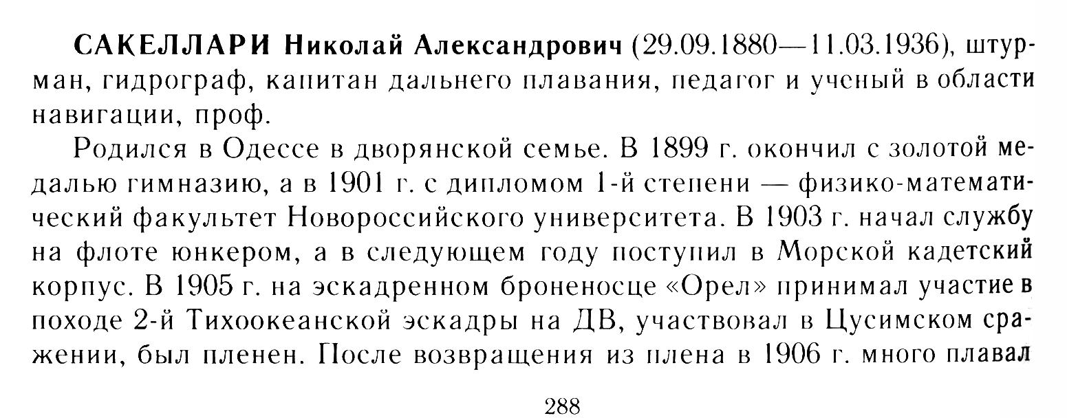 САКЕЛЛАРИ Николай Александрович (29.09.1880—11.03.1936), штурман, гидрограф, капитан дальнего плавания, педагог и ученый в области навигации, проф.