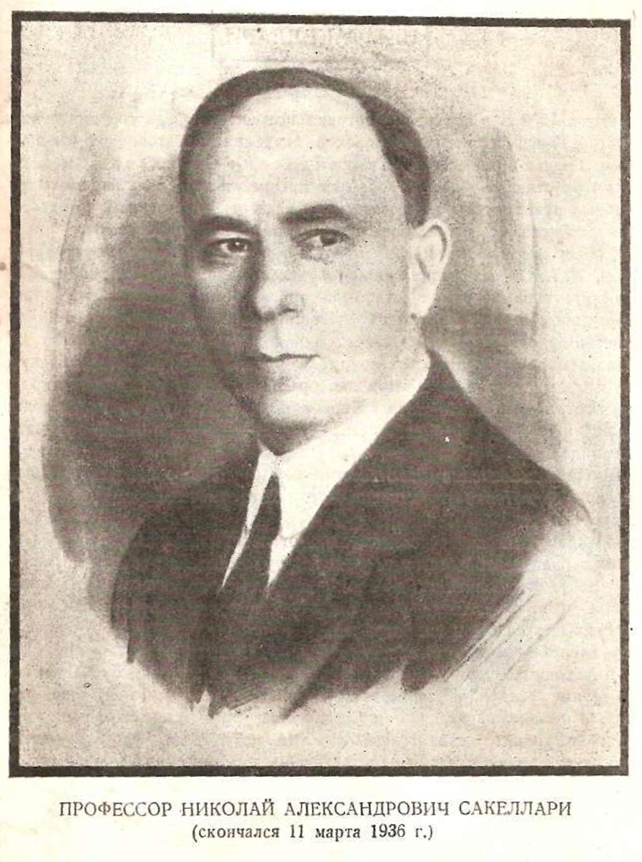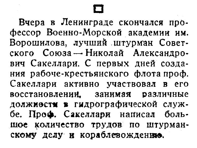 Вчера в Ленинграде скончался профессор Военно-Морской академии им. Ворошилова, лучший штурман Советского Союза — Николай Александрович Сакеллари. С первых дней создания рабоче-крестьянского флота проф. Сакеллари активно участвовал в его восстановлений, занимая различные должности в гидрографической службе. Проф. Сакеллари написал большое количество трудов по штурманскому делу и кораблевождении».
