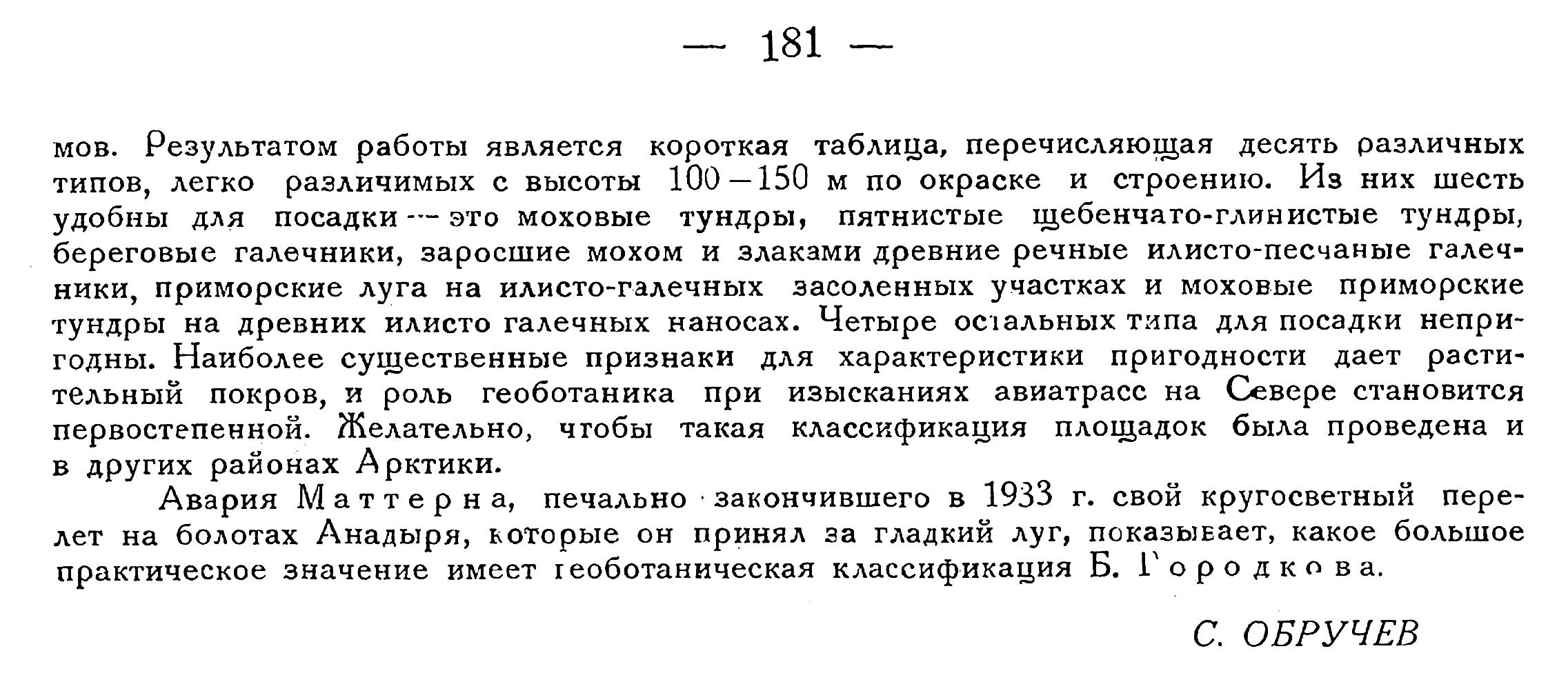 Авария Маттерна, печально закончившего в 1933 г. свой кругосветный перелет на болотах Анадыря, которые он принял за гладкий луг, показывает, какое большое практическое значение имеет геоботаническая классификация Б. Городкова.