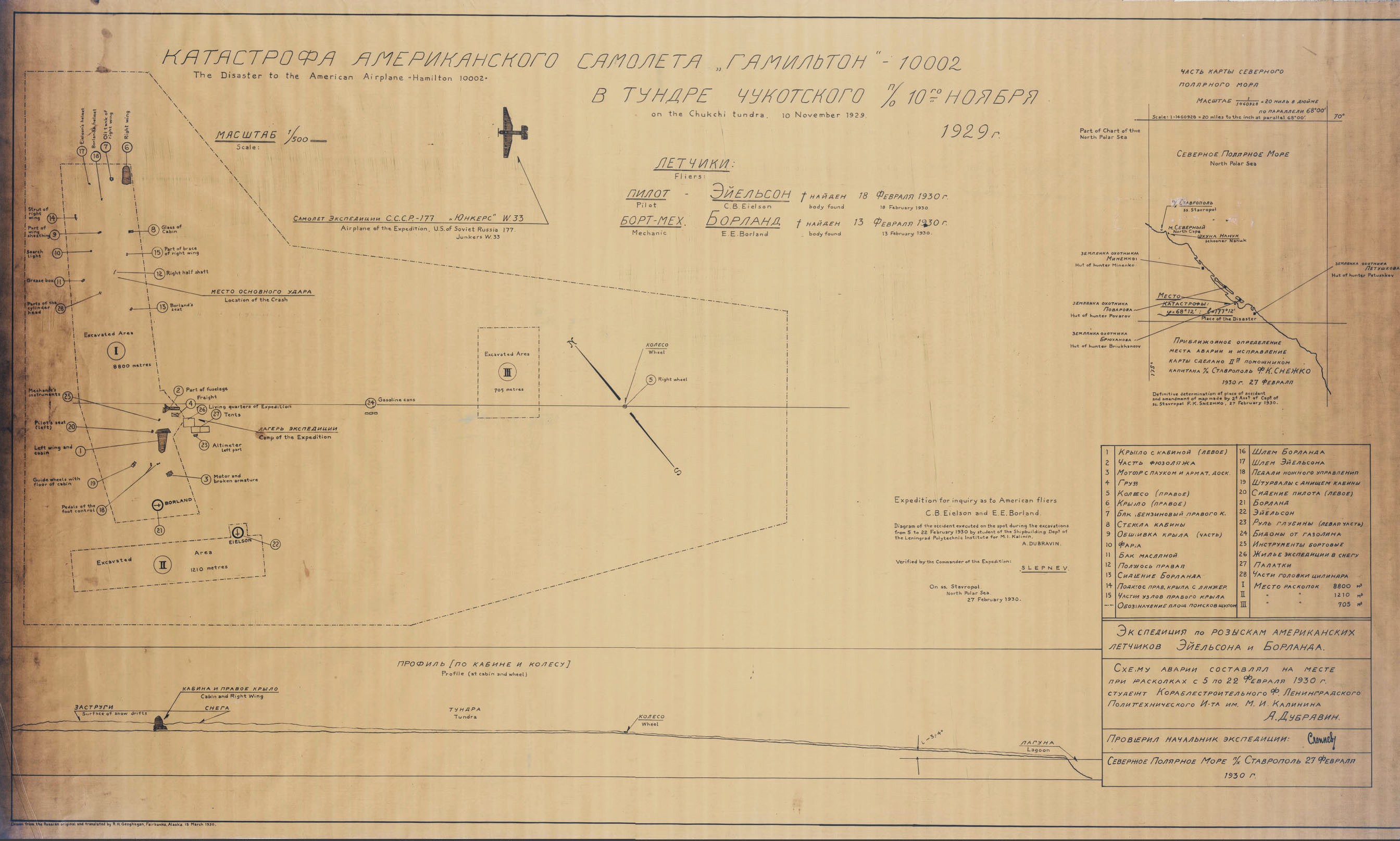 М. Г. Слепнев поручил мне составить схему катастрофы и быть «историографом» экспедиции. Конечно, с меня не снимались и работы по раскопкам около самолета.