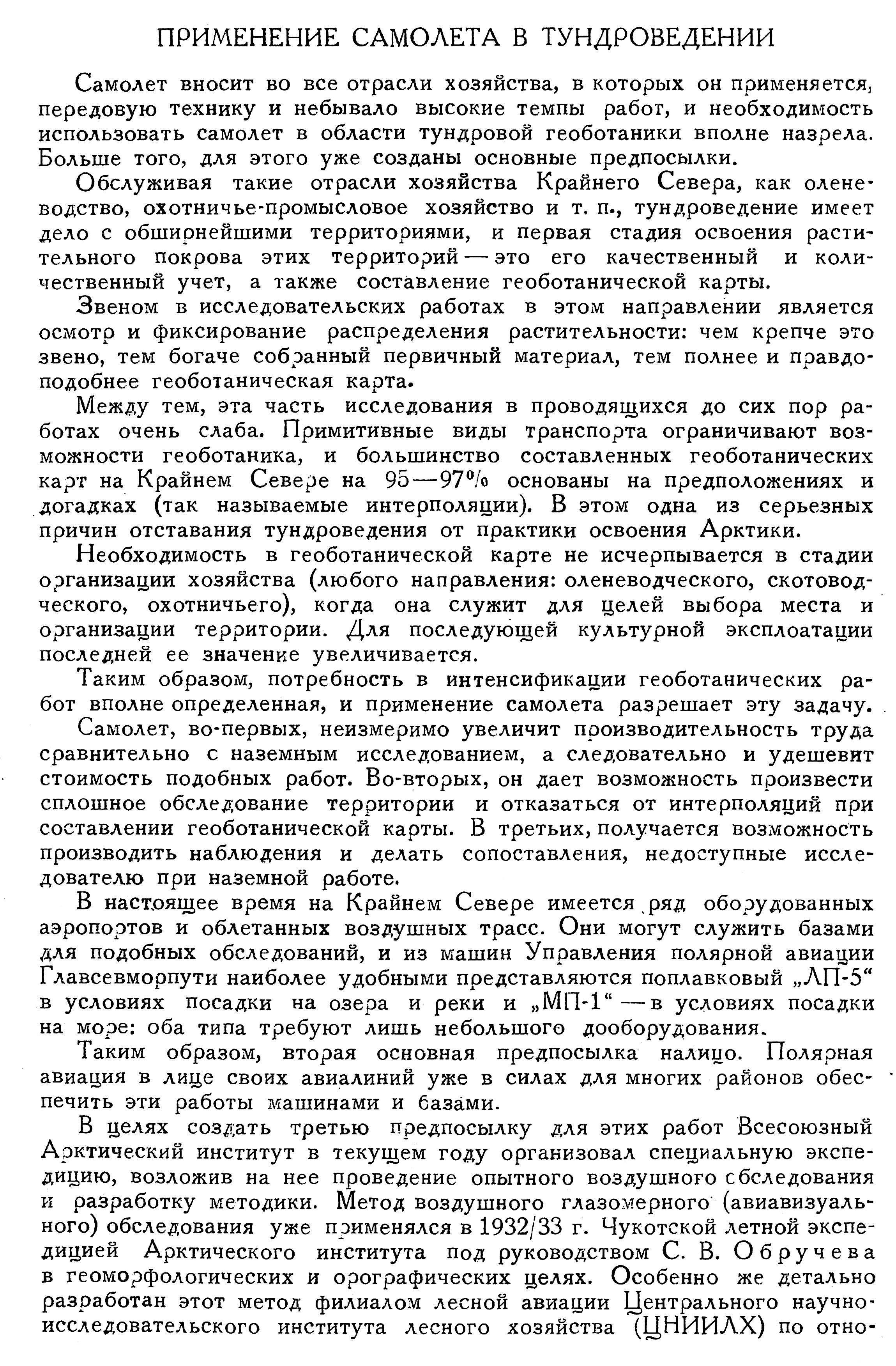 Самолет вносит во все отрасли хозяйства, в которых он применяется, передовую технику и небывало высокие темпы работ, и необходимость использовать самолет в области тундровой геоботаники вполне назрела. Больше того, для этого уже созданы основные предпосылки.