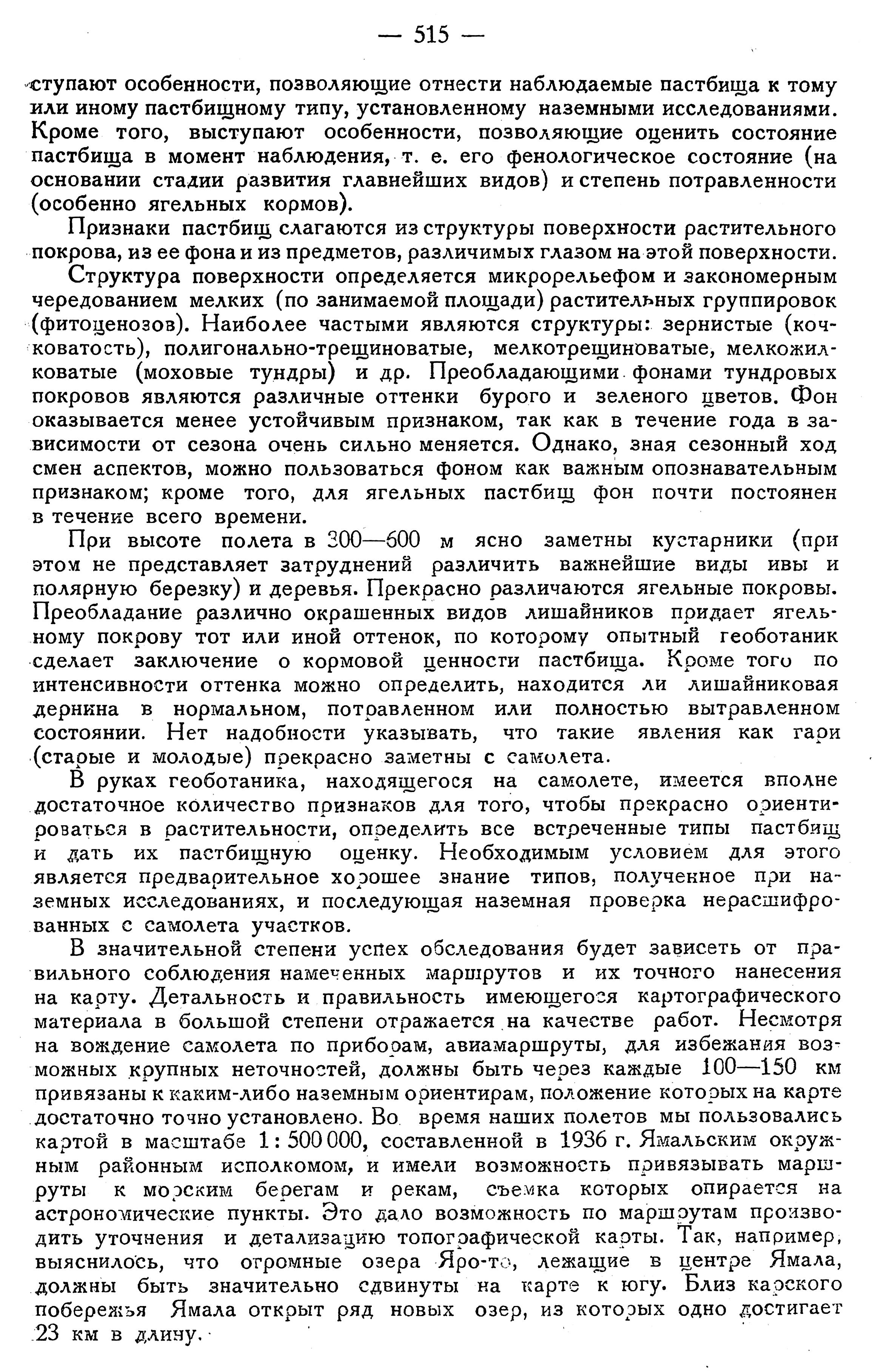 На основании нашего опыта работы могут быть сделаны следующие выводы: во-первых, безусловно метод воздушного обследования оленьих пастбищ тундровой и лесотундровой областей может дать необходимые материалы для составления геоботанической пастбищной карты и кормовой характеристики основных ее выделов. Точность обследования по предварительным данным не может уступать точности применяемых в настоящее время наземных методов обследования; во-вторых, метод воздушного обследования не может быть оторван от наземных работ и должен сочетаться с последними; в-третьих — в целях правильной накладки на карту данных авиасъемки, необходима топографическая основа (в масштабе от 1: 1 000 000 до 1: 200 000), опирающаяся на астропункты и имеющая хотя бы на расстоянии 100—150 км друг от друга хорошо заметные заснятые инструментально или полуинструментально ориентиры (реки, озера, берега морей и т. д.).