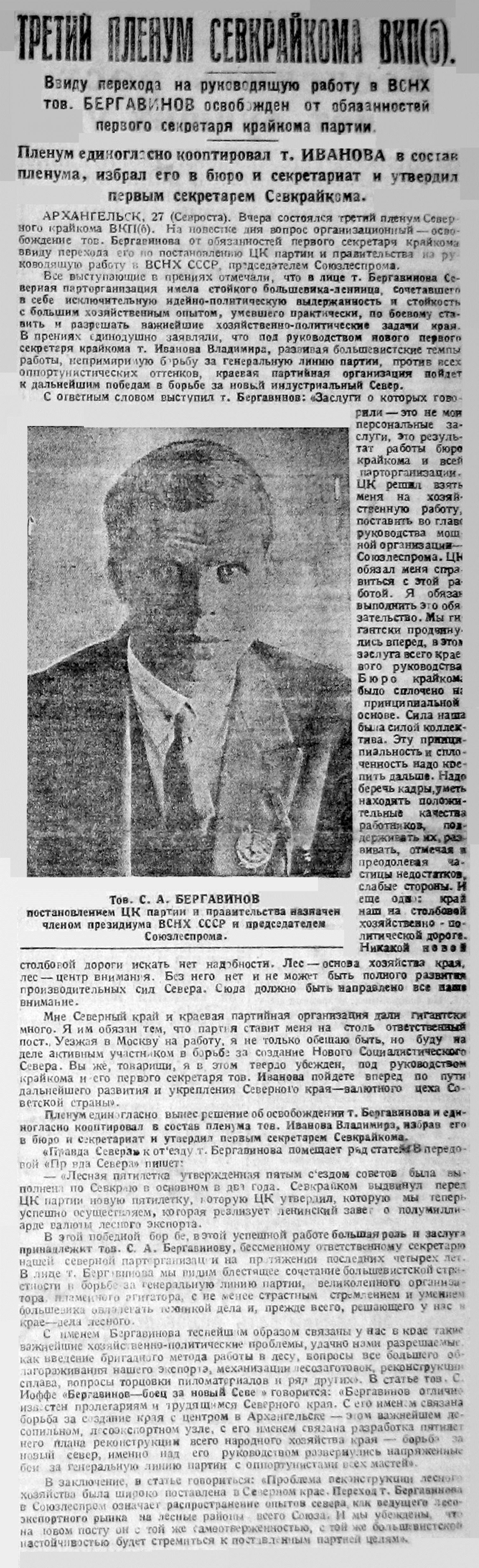 ТРЕТИЙ ПЛЕНУМ СЕВКРАЙКОМА ВКП(б)Ввиду перехода на руководящую работу в ВСНХ тов. БЕРГАВИНОВ освобожден от обязанностей первого секретаря крайкома партии.Пленум единогласно кооптировал т. ИВАНОВА в состав пленума, избрал его в бюро и секретариат и утвердил первым секретарем Севкрайкома.АРХАНГЕЛЬСК, 27 (Севроста). Вчера состоялся третий пленум Северного крайкома ВКП(б). На повестке дня вопрос организационный — освобождение тов. Бергавинова от обязанностей первого секретаря Крайкома, ввиду перехода его по постановлению ЦК партии и правительства на руководящую работу в ВСНХ СССР, председателем Союзлеспрома.