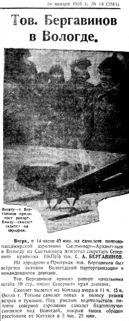 "Правда Севера" к отъезду т. Бергавинова помещает ряд статей. В передовой «Правда Севера» пишет: