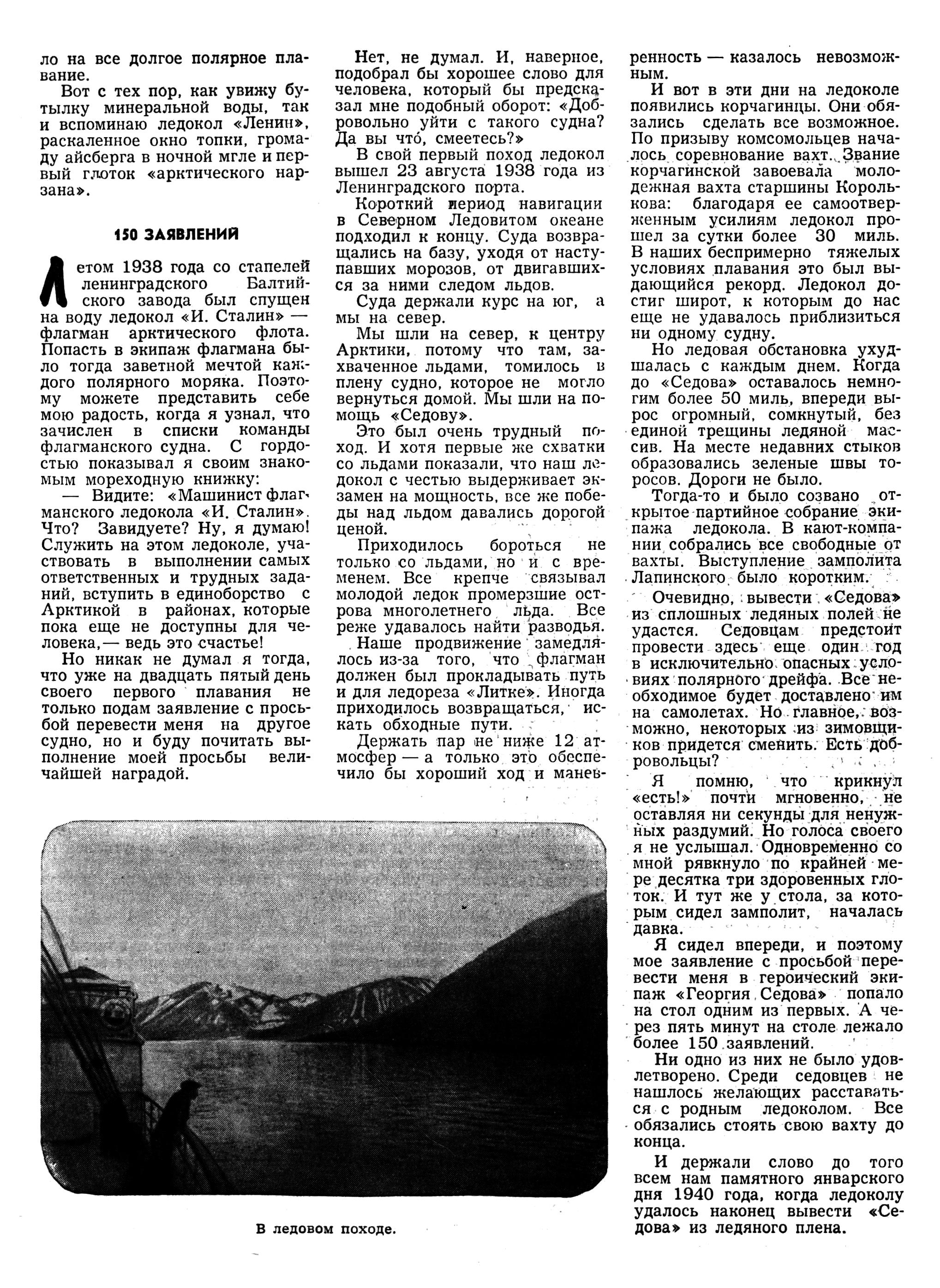 И вот в эти дни на ледоколе появились корчагинцы. Они обязались сделать все возможное. По призыву комсомольцев началось соревнование вахт. Звание корчагинской завоевала молодежная вахта старшины Королькова: благодаря ее самоотверженным усилиям ледокол прошел за сутки более 30 миль. В наших беспримерно тяжелых условиях плавания это был выдающийся рекорд. Ледокол достиг широт, к которым до нас еще не удавалось приблизиться ни одному судну.