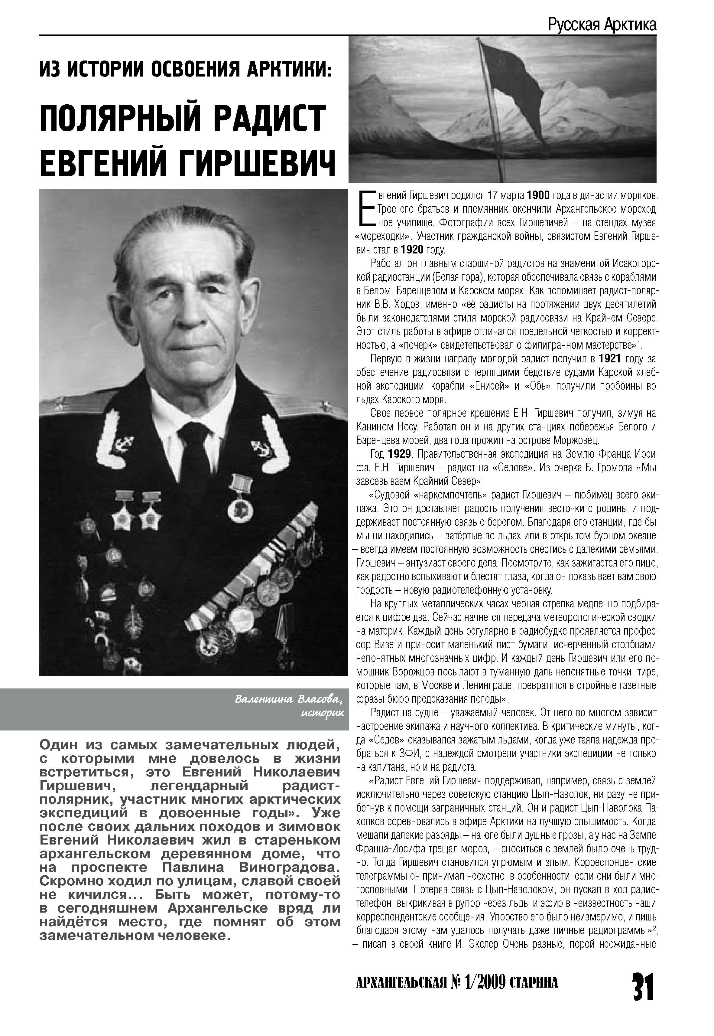 Один из самых замечательных людей, с которыми мне довелось в жизни встретиться, это Евгений Николаевич Гиршевич, легендарный радистполярник, участник многих арктических экспедиций в довоенные годы». Уже после своих дальних походов и зимовок Евгений Николаевич жил в стареньком архангельском деревянном доме, что на проспекте Павлина Виноградова. Скромно ходил по улицам, славой своей не кичился… Быть может, потому-то в сегодняшнем Архангельске врядли найдётся место, где помнят об этом замечательном человеке.